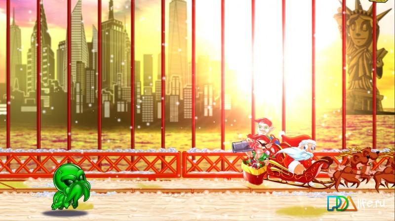 Cthulhu v Santa Claus для Андроид горизонтальный ранер с необычным подходом, ведь на этот раз вам предстоит не убегать, как в большинстве игр этого жанра, а догонять и не кого-нибудь а самого Санта Клауса. Да вот так, вам в роли бога Ктулху необходимо догнать новогодние сани и потребовать от бородатого старика причитающиеся вам подарки.