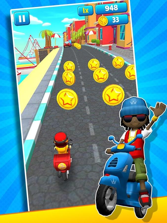 Subway Scooters Free-Run Race – runner for Android in which you control a pizza guy. You have a dangerous job, you need time to deliver pizza from one end of town to the other it does not face obstacles and collect all the bonuses. Deliver as fast as possible a pizza at home and get a decent tip that will help you unlock seven different drivers with a new scooter. Perform assigned missions and daily quests, enjoy the colorful graphics and variety of levels and receive gifts and surprises.