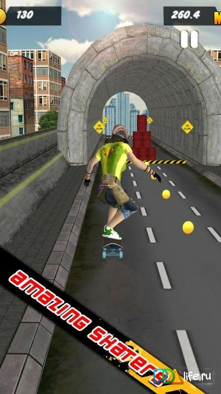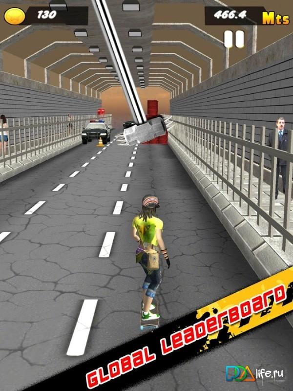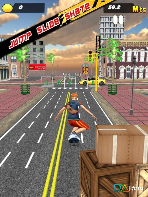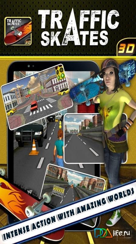 Traffic Skate 3D - a classic representative of the genre runner, in the best traditions of the series. The overall concept of the game created in a futuristic style, in the rest of the Traffic Skate 3D for Android is not much different from its many counterparts. After selecting your character and vehicle, and it s all kinds of skates, and boards go into an endless race in four unique worlds, on the road trying to avoid collision with obstacles and collecting coins, bonuses and improvements. The earned bonuses you can spend on the purchase of inventory or improve an existing one. It is worth noting the excellent excellent soundtrack, a good three-dimensional graphics, as well as the ability to perform various acrobatic stunts.