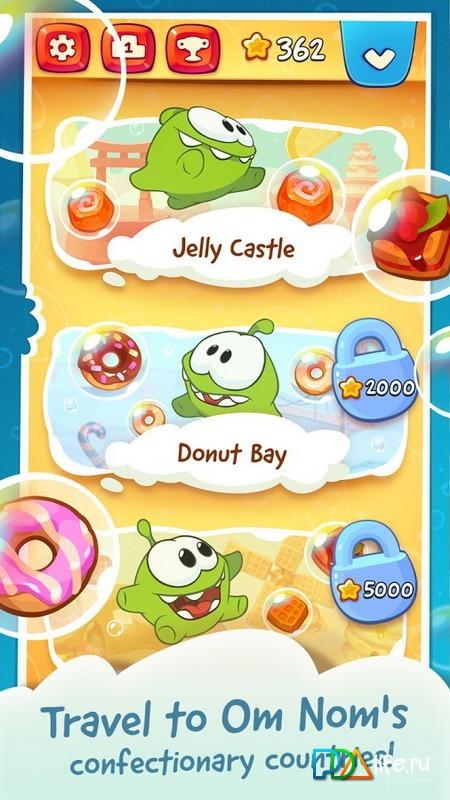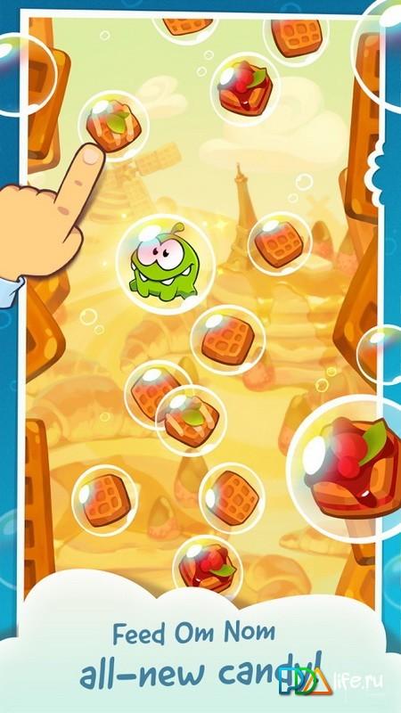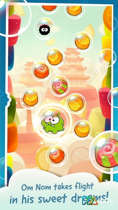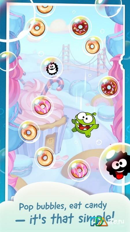 Om Nom: Bubbles – новое увлекательное приключение сладкоежки Ням Няма по сбору конфет, вафель и пончиков. В этой игре наш герой спит и во сне представляет, как он поедает сладости. Помогите нашему герою перемещаясь по воздушным пузырям собирать конфеты и при это избегать злых пауков. Пока Ням Ням спит соберите как можно больше конфет и получите по три звезды на каждом уровне. Удерживайте зеленого героя от падения иначе он проснуться и будет расстроен что не съел достаточное количество конфет. Набирайте очки и открывайте для себя новые интересные уровни с забавным героем. Игра отлично оптимизирована для работы на телефонах и планшетах с высоким разрешением экрана.