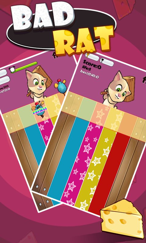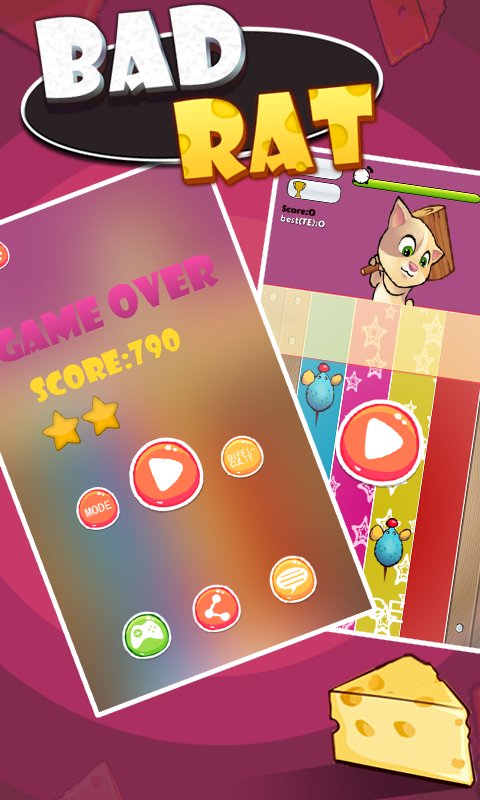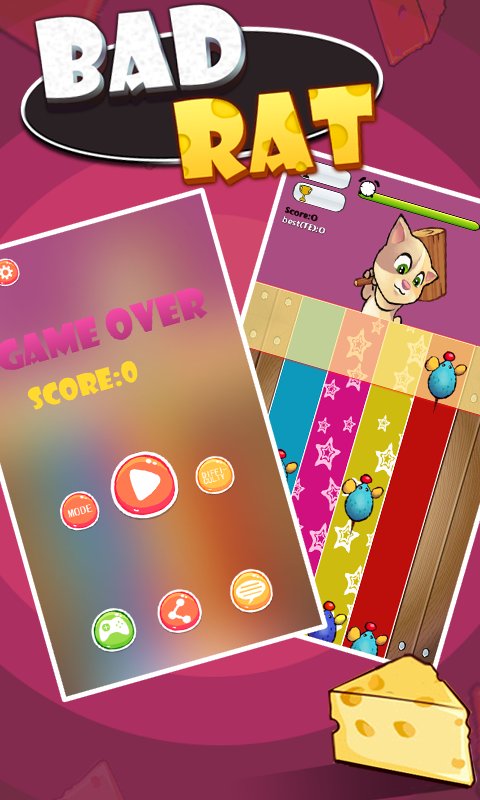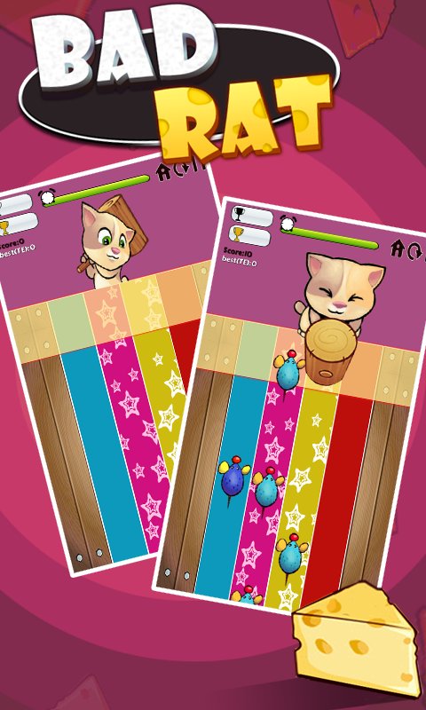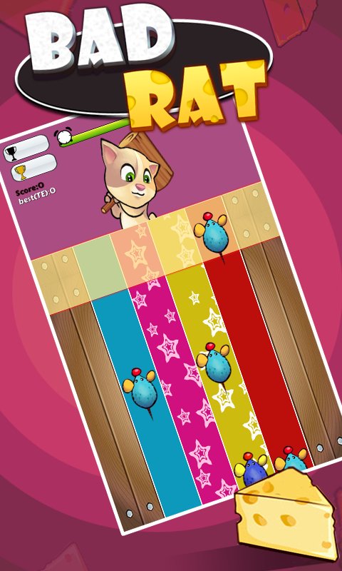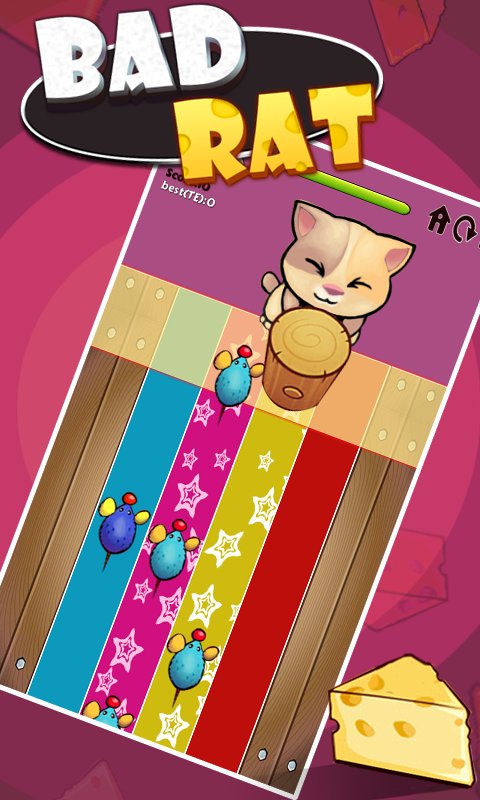 Bad Rat – весёлая казуальная игра, которая, к тому-же проверяет вашу реакцию. Шесть разноцветных линий по которым могут с бешенной скоростью бежать мыши. Берём в лапы молоток и помогаем бесстрашному коту из-за всех сил стукать кувалдой по мышам. Не простите их на ваши владения! Игра занимательная, в неё интересно играть с друзьями. Тренируйтесь, набивайте руку и покажите что вы способны побить любой рекорд.