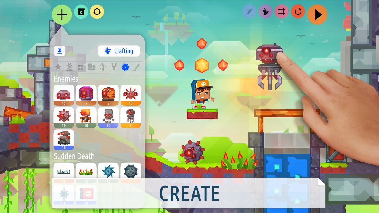 Createrria 2 craft your games! – отличная игра-инструмент, который предоставляет вам возможность создавать самому свои игры всего за несколько минут и делиться ими с друзьями. Ни каких навыков программиста или художника вам не надо. Все необходимые инструменты у вас перед глазами. Хотите поиграть в что-то подобное angry Bird? Тогда медведь-каскадёр к вашим услугам, достаём рогатку и стреляем… Уровни можно создавать с различных материалов и пусть игроки их разрушают просто до основания. Создать интересный платформер тоже не проблема. Всего несколько минут и уровень готов.