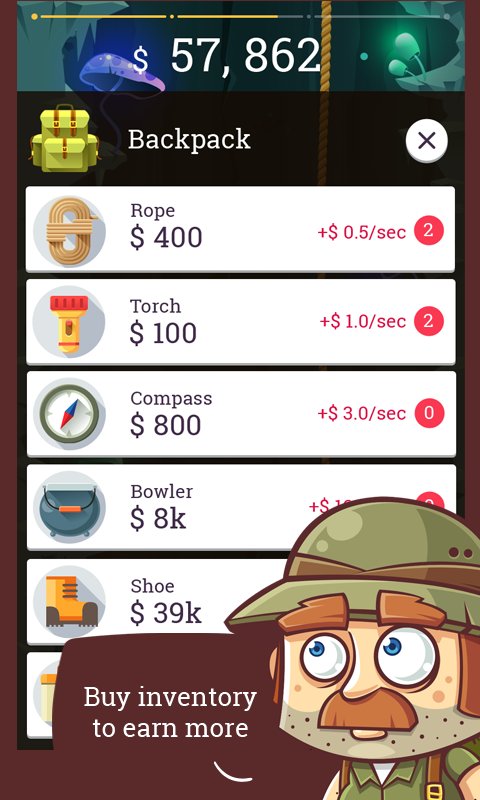 Golden Depth – clicker game for Android where you will help the brave researchers to extract gold. Our brave traveler named Sven Duk with his nephew went to explore a dangerous cave that leads to the city of Sorge, where it stored a huge amount of gold, gems and ancient artifacts. Our researcher has a complete map of this place and can easily find the entrance to the ancient city. Do you understand all of the above on the rift and collect all the gold on your way, without losing not a single piece, and also fight enemies and gather resources. Your only task will be to click on the phone screen, and collect gold. The collected gold to buy myself a rope, flashlight, food, a compass and other equipment that come in handy to you along the way.