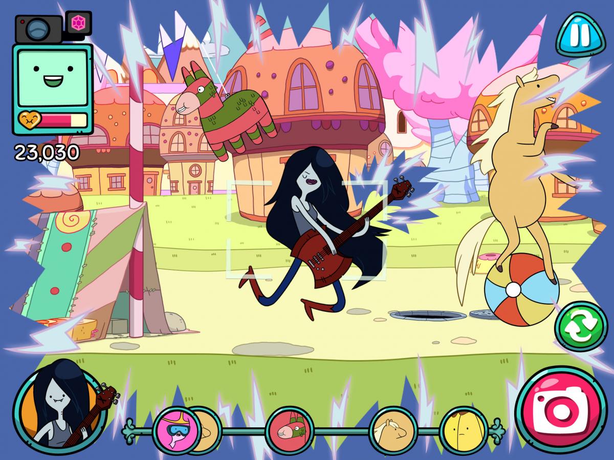 Snaps BMO - Adventure Time Photo Game is an exciting game where you pick up a camera and is taking pictures. Through difficult research ubiquitous hologram broke free and now you have to stop them. Take up a camera and take pictures of the twins fin and Jack, catching thereby a hologram and receiving the coins. Aim the lens and take pictures as fast as possible, destroying the holograms until they fled. The game will delight you with colorful graphics, familiar characters of the cartoon, and also many bonuses and bosses, which is not so easy to catch.