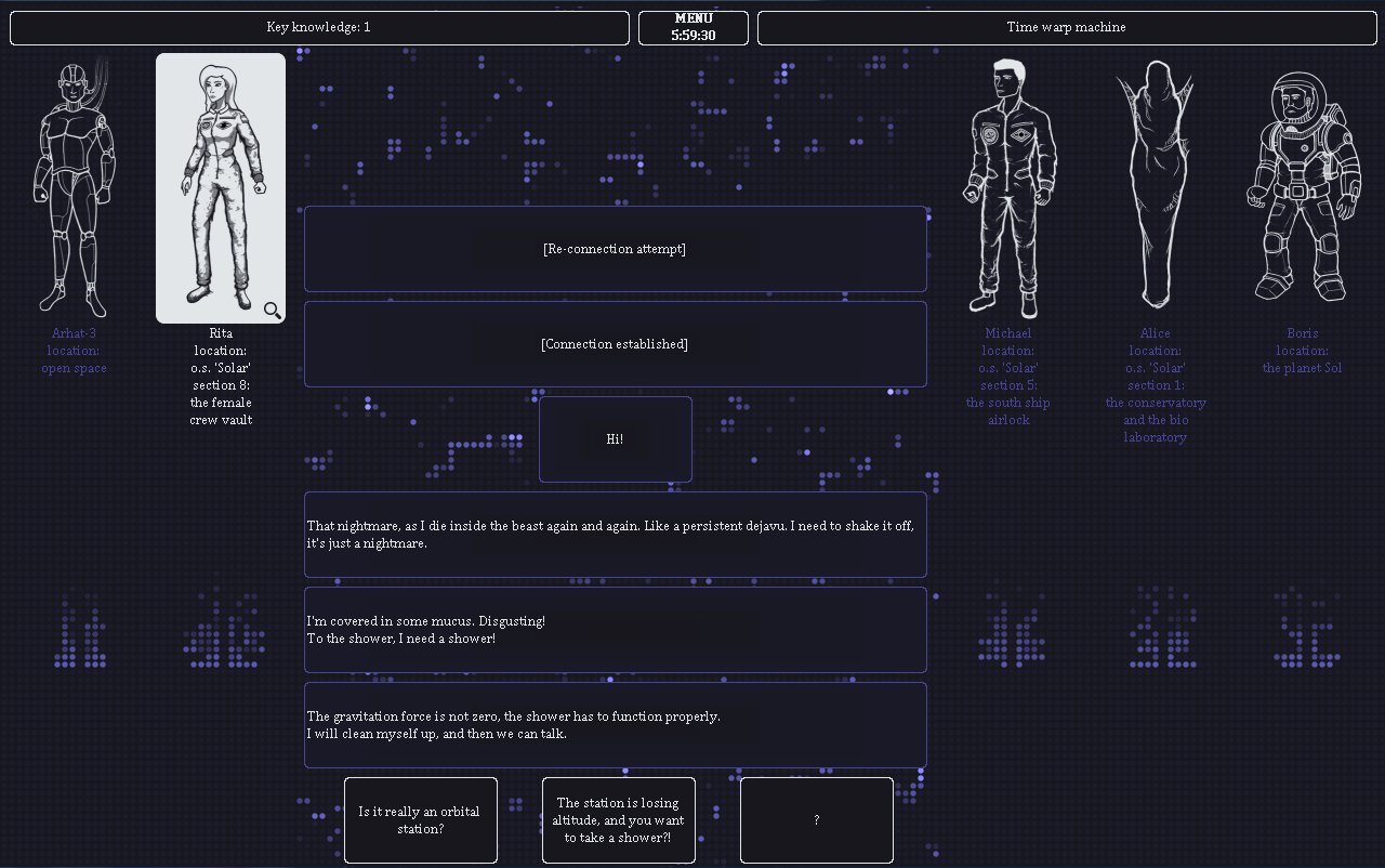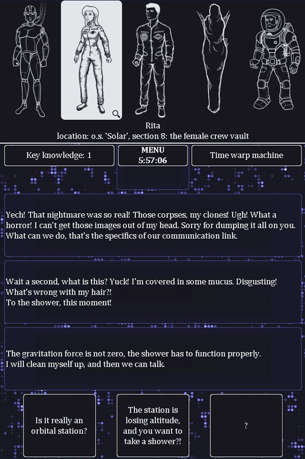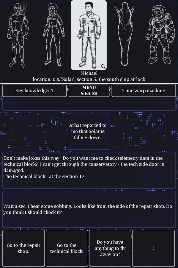 The Lost Crew – interactive puzzle game for Android where you will become a key figure in the rescue of the crew of the station. Communication with the orbital station has been lost and you are the only one who they could contact. Your task will be to help five members of the crew not to die and for six hours with various teams to resolve their problem. You will be able to communicate with all the heroes of the game, each of them will tell you my story and show your character. Our heroes were not the easy way out, visited various unusual places of the vast universe, don t let them die burned in the earth s atmosphere in six hours. Solve tricky puzzles and lead the dialogue with the entire team. How to end this game depends on you the game has 32 version of the finals from good to terrible.