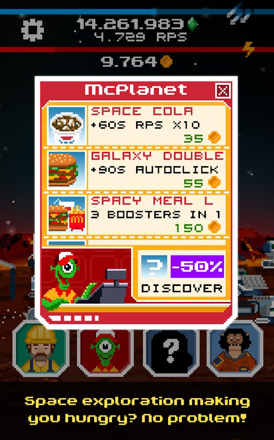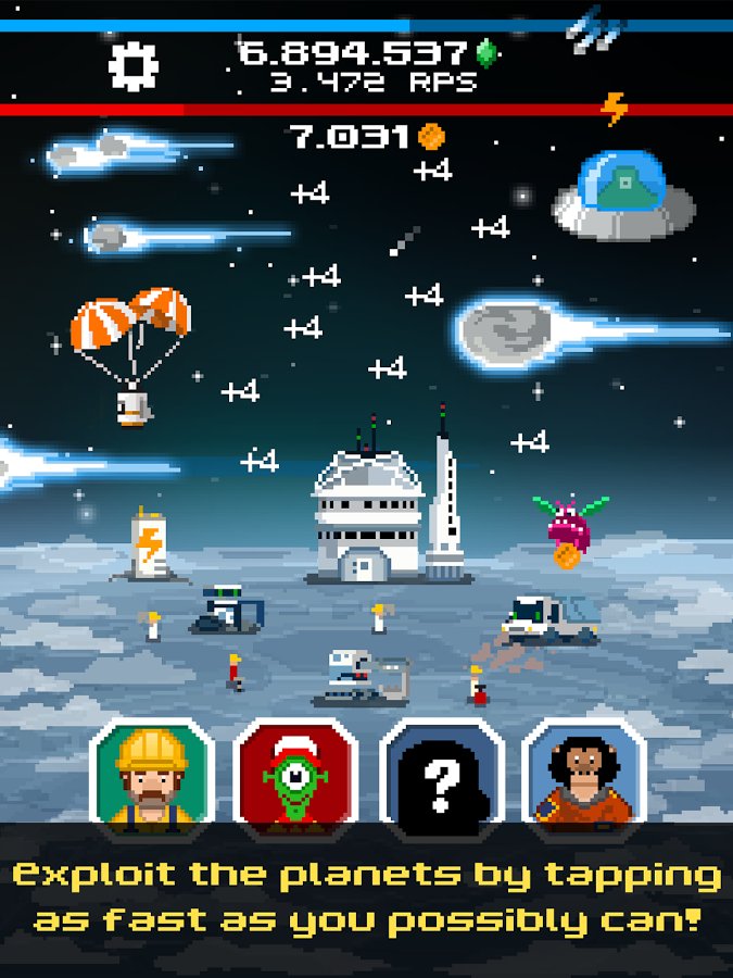 Tap Galaxy - Deep Space Mine – game for Android, made in pixel art where you have to gather resources. Embark on an exciting journey to numerous planets, asteroids and comets, and get resources clicking everywhere as often as possible on the screen of your device. Build a huge space Empire on the collected resources and build space ships, sending them to explore the cosmos on the availability of resources. Find a new planet rich in resources and minerals and develop your Empire. Meet the many characters of the game and explore the vast galaxy.