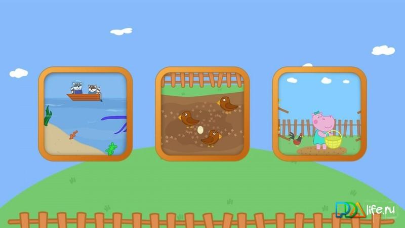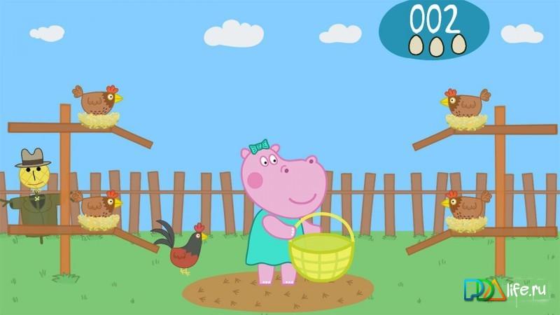 Baby Farm is an interesting game for children of preschool age, which consists of three mini-games designed for different ages. In this game, each child of any age will find something interesting. Help Hippo Pepe to harvest on the farm. In the first mini-game you will help the main character to assemble a basket of eggs from the hens. Level to be four chickens, each of which carries eggs, your task is to collect them in the basket, when they will roll on the perch. Not miss more than one egg because all you have three lives. The second mini-game designed for younger children it the child needs to click on a chicken to get eggs, and if you click on the egg to get a chicken. In the third game you will help the raccoon to collect pearls, dive into the water and avoid a scary octopus, collecting pearls.