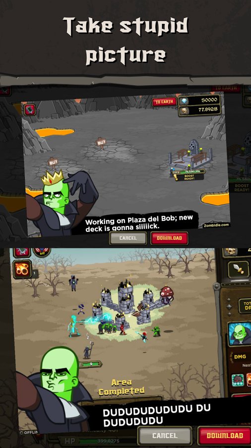 Based on a new addictive game called Zombidle lies the gameplay is borrowed from the popular genre of clickedrow. Your task with the help of taps to destroy various buildings, inhabited by monsters, zombies and other evil spirits. For the destruction sdani, and the monsters themselves you will get all sorts of bonuses which you can spend on improving their skills, acquisition of equipment, and that s all you ll need because with each level it will be much more complex, built from wood will become a real fortress, and the monsters are markedly increased in the weight category. In addition to RPG elements in the form of development, the developers added and some mechanics characteristic strategies. Do not forget about the unusual stylized graphics and a sea of humor that you will find for all the games.