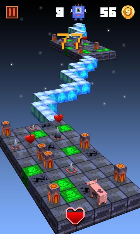 Zigzag transitions - Well, it s time to test your wits and reaction, and this app will come in handy. The essence of the game is very simple, you need to tap on one of the two parts of the screen, what would your character jump forward or sideways. The end of the level is not present, so more jumps is the winner. But all is not so simple, because the longer you stand still, the faster will fall a level behind you. The game has quite nice graphics and as you progress through the level will change not only becomes more difficult, but simply to change its nature, and traps. In some you will be freezing, others, on the contrary to burn. Very fun time killer.