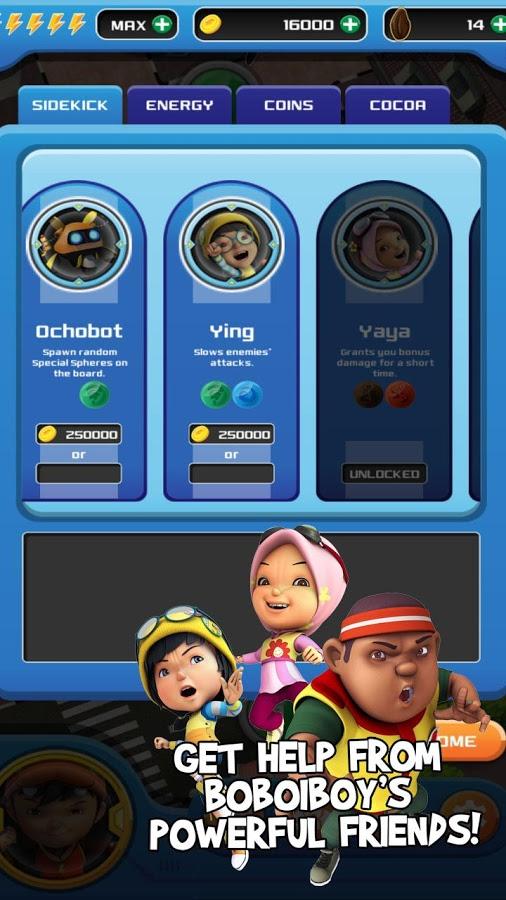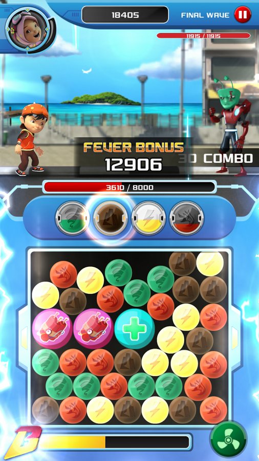 BoBoiBoy: Power Spheres – an exciting game for Android, made in the story of the famous cartoon. In this game you will help the little boy to fight with alien treasure hunters who came to our planet in search of jewelry. Collect three and more same colored balls in order to collect enough energy and strike at the enemy. The more energy you collect, the hero, the stronger the impact. Sort the balls among themselves and make as long chain of same color balls. Store energy to fight with powerful bosses and get your hero fancy new equipment. Unlock new characters and complete over 100 levels.
