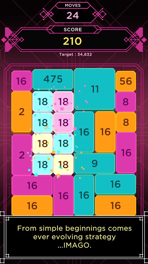 Imago - Puzzle Game – addictive puzzle for Android, which takes you on a field with many figures and numbers. In this game your main task will be to move between different shapes, combining together the same color and value. As soon as the pieces come together, they will add their values and increase the size. When the shapes have reached their maximum size they split into a few, but will have the same value. Match shapes and collect enough points to get the opportunity to compete with friends for best results. The game will delight you with minimalist graphics, simple controls and multiple game modes.