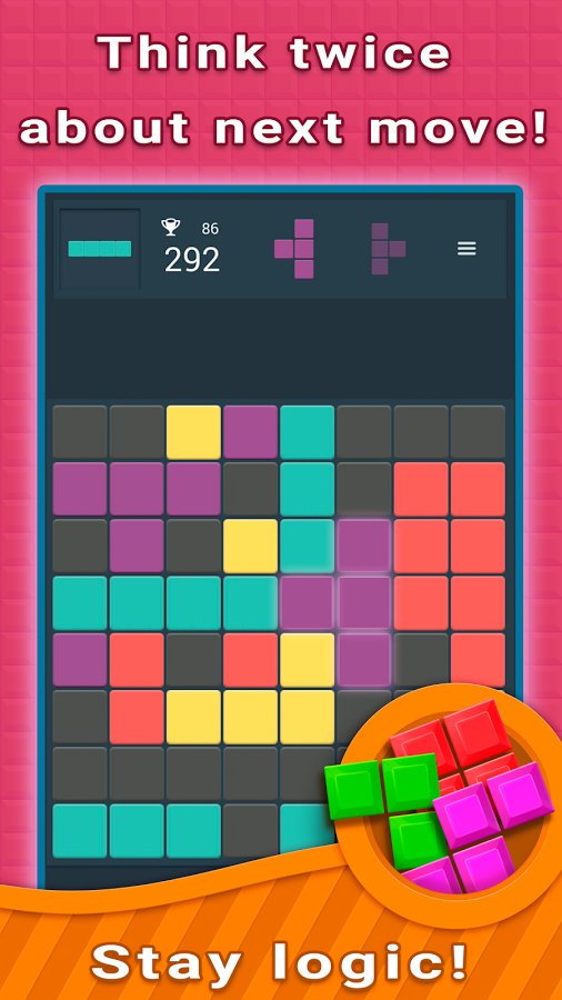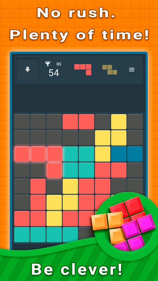 Quadromino - no rush – it is a fascinating puzzle for Android, which will bring the world of various shapes. In this game you will see a field consisting of multiple cubes, your task will be to place the figures so that there is no free space. Pull a single thread out of blocks the screen from beginning to the end and destroy it, freeing up space for other figures. Take the figures in the upper part of the screen and place them on the field. The difficulty of the game will be in the fact that the figures cannot be rotate and flip. Collect points and enjoy the fun gameplay. The game ends when the field will be filled in with figures.