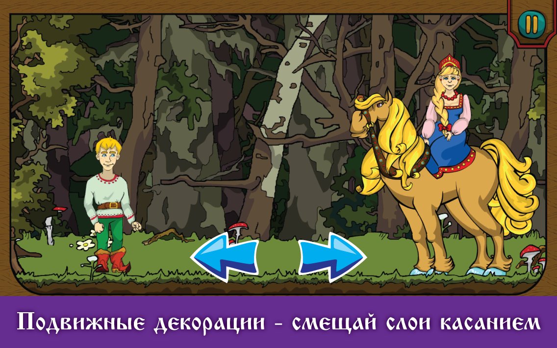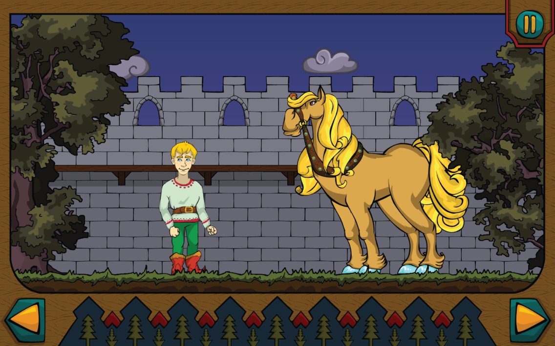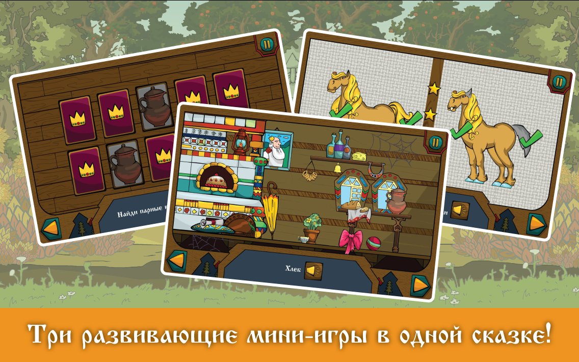 Ivan Tsarevich and the Grey wolf - excellent illustrated tale for children of preschool age. In this fairy tale game your child get reacquainted with the already familiar heroes Ivan Tsarevich and the Grey wolf. Graphics of this game is made in traditions of Russian illustration, where you and your child can have fun developing and helping Ivan to solve challenging puzzles. In the game there are three exciting mini-games such as find the object , memory and spot the difference that will surely please your child. Play this game with your child and can instill in him a taste for good games.