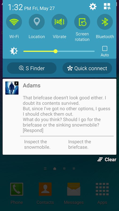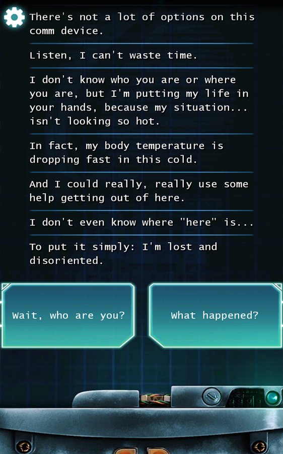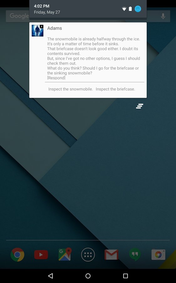 Lifeline: Whiteout - fascinating interactive book-game for Android. In this game you will meet a new hero Adams V which will need your help to get out of snow captivity. Our hero was alone in the middle of the ice and snow, he lost his memory and does not remember how ended up in this horrible place, the only one with whom he has a relationship is you. In this game you will take responsibility for a man who is in trouble, your decisions will determine his fate. On your Android phone or tablet will receive the notification during the day and you have to make choices and make the right decisions to help Adams get to the nearest safe place and help him get his memory back. This story has multiple endings that will depend on your decision.