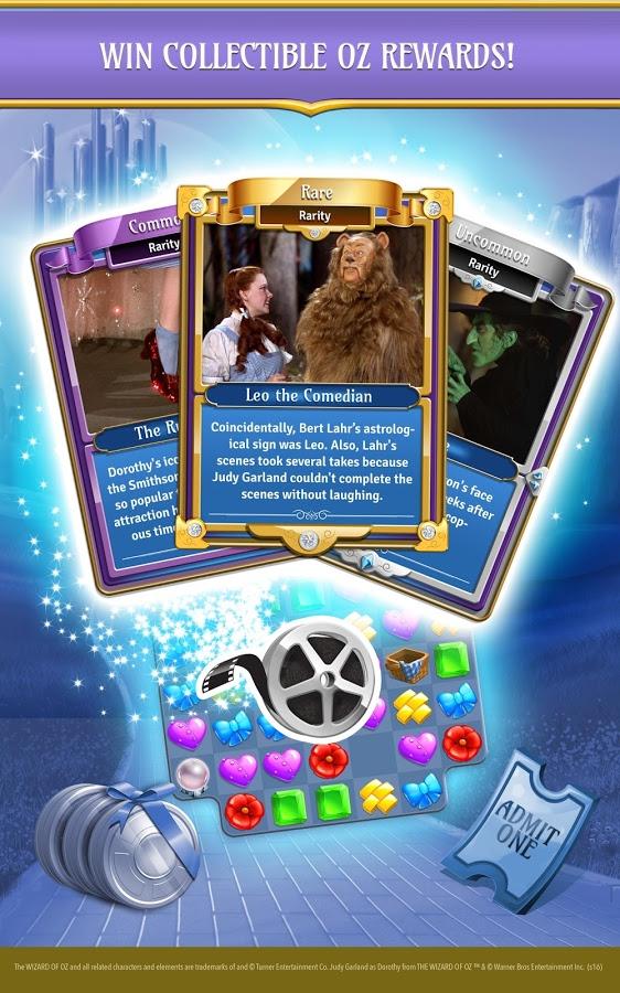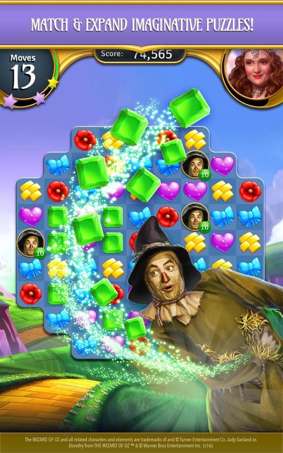 Wizard of Oz: Magic Match – the incredible adventures alongside the famous characters in the movie THE WIZARD OF OZ . The game is a genre of three in a row with a number of advanced features, mini games and original voice from the tape. Challenge an evil witch and keep up with the evil forces. Don t let them overcome your spell. As with all games of this genre, you need to collect three or more elements in one line, then these elements will disappear from the field, and you will be awarded extra points. Make combos and get even more points. various bonuses will amaze you and help in the game.
