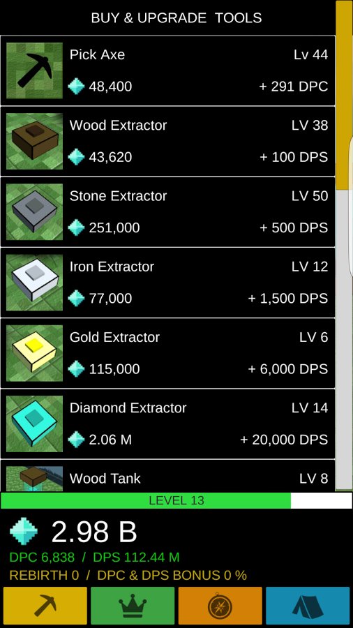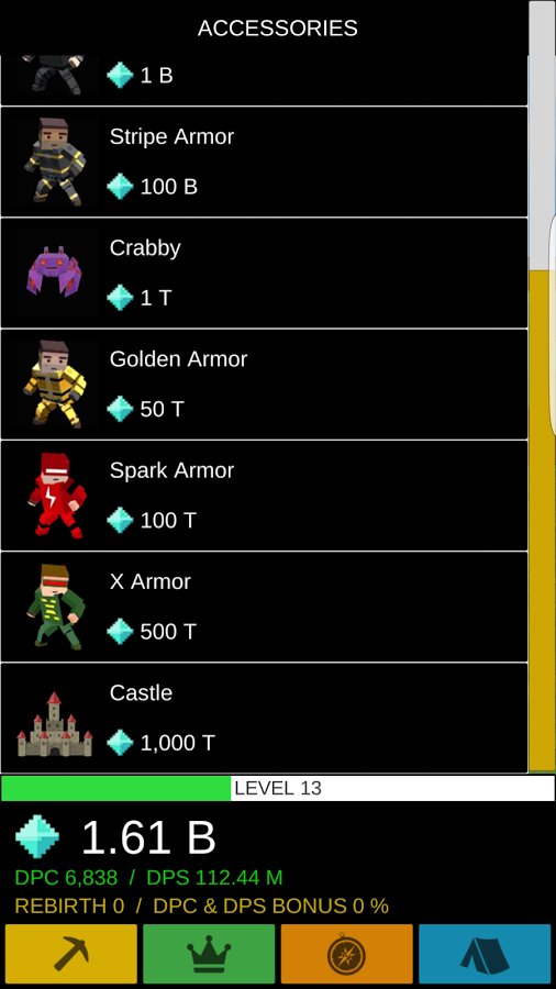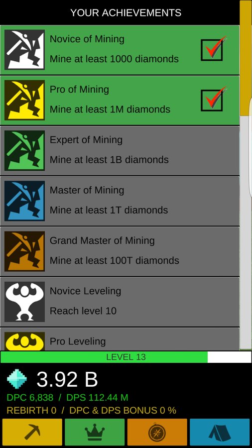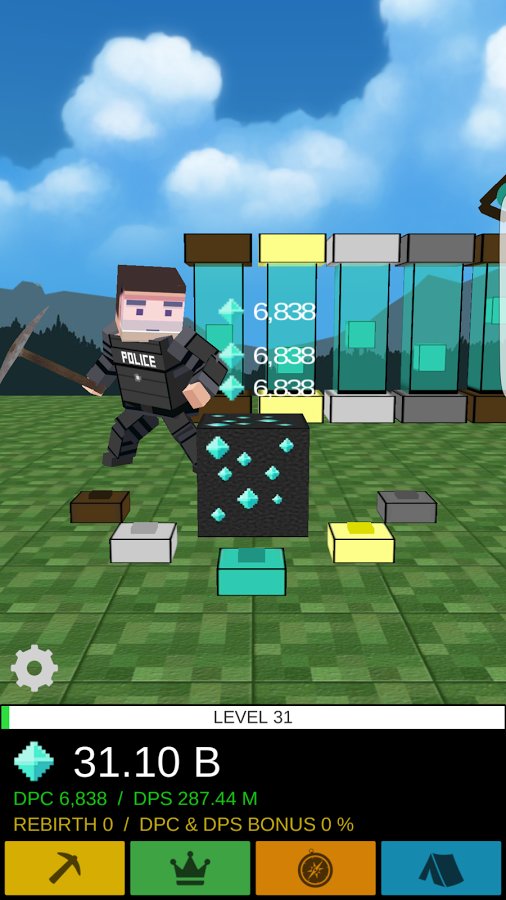 Mine Click – clicker on Android, where you will control a brave digger. In this game your main task will be to click on the screen of your phone or tablet as often as possible that the hero was struck with a pick on a huge rock, within which are hidden gems. Push on the screen as often as possible and with great speed to get as many gold, gems and diamonds. The more you will have the jewels than the large opportunity in front of you will open, such as the purchase of new equipment to facilitate the work, the purchase of costumes for the hero and pet, so it was not boring. The game will please you simple controls, achievements and funny Pets.