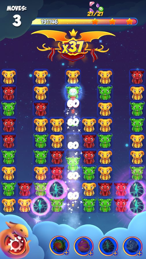 Sky Dragon Stars: Magic Match – the game three in a row on Android, where you will be taken to the dragon Kingdom. In this game your task is to connect three or more same type of dragons and their eggs in a row and clear them from the Board. Use all your logic and observation skills to make as long as possible and to score maximum points. Perform all tasks and missions offered in this game and increase your rating. Use various bonuses and power-UPS in order to pass the level as quickly as possible and to achieve record results. Discover the magic dragon eggs and get valuable prizes and gifts.