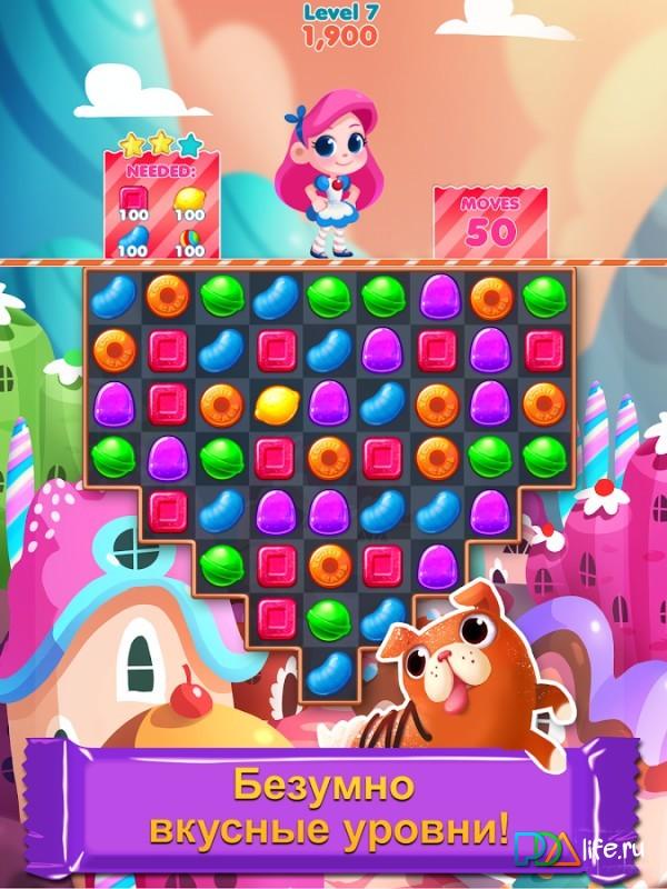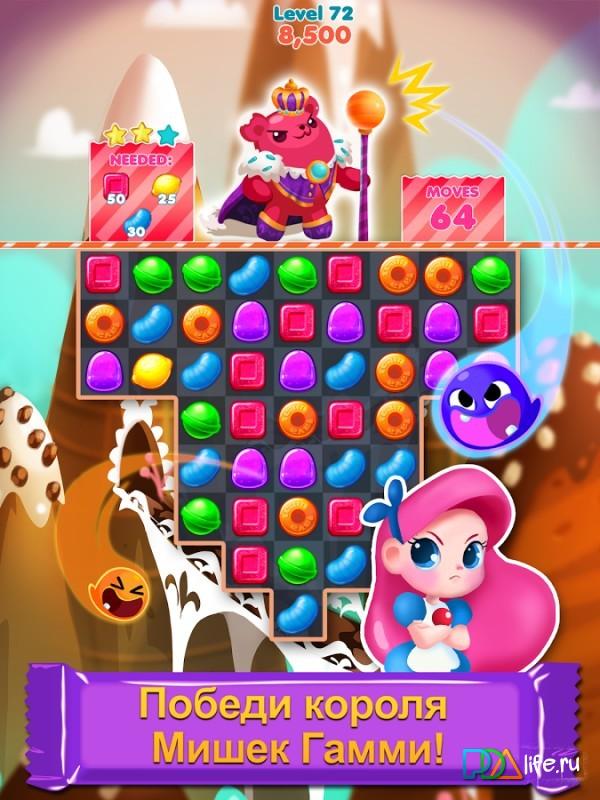 Candy Blast Mania: Travel – a fascinating game on Android in which you are transported into a fairytale world made of candy. The evil king who rule the Kingdom of the gummy bears took over the world and wants to get all the candy, do not let him to do it. Match three or more same colored candies in lines and blow them up, enjoying the colorful explosions and special effects. Played and start a chain reaction of candies and make combo attacks. Earn points for completed missions, and get awarded great bonuses and power-UPS. Install your high scores in this game and climb to the top of the leaderboard.