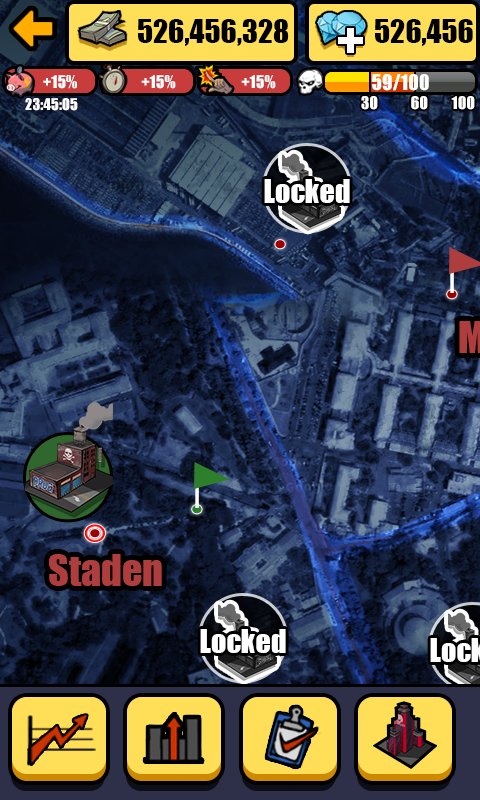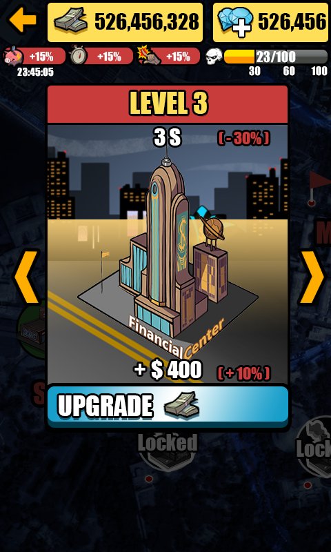 Crime City Tycoon – clicker game for Android where you will play the role of a leader of a criminal gang who managed to seize all power in the city. Expand your power in the city and seize new territory and compete with local bandits, participating with them in an uncompromising war. Develop an illegal business which will bring you much profit and power. Sell weapons and drugs, and open up casinos and clubs. Get superior profits from your business and you bribe the police and competitors, which can interfere with you to grow your business. Take to his new gang members of the underworld and increase your power. Take control of the entire city and fight for power.