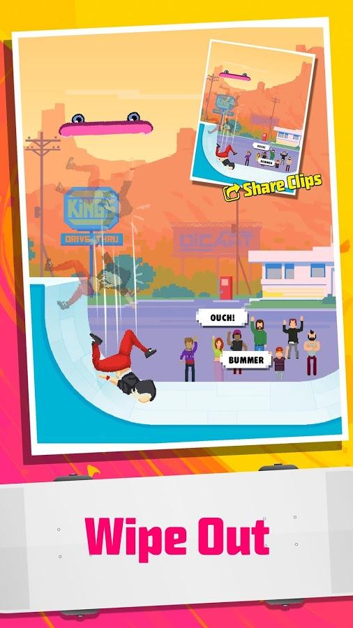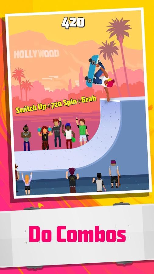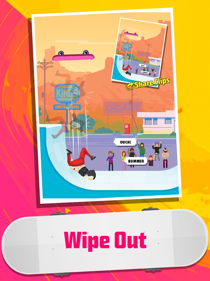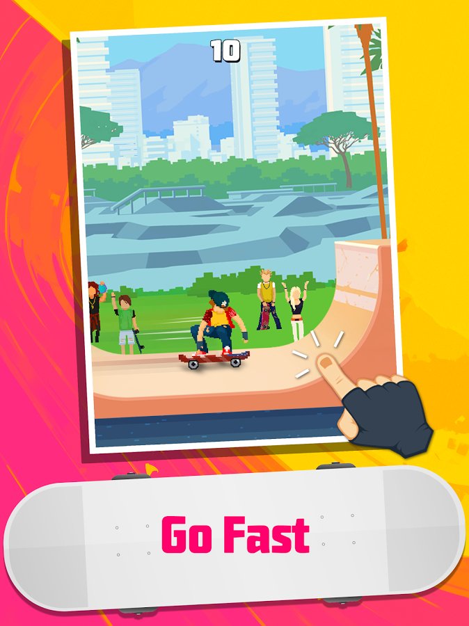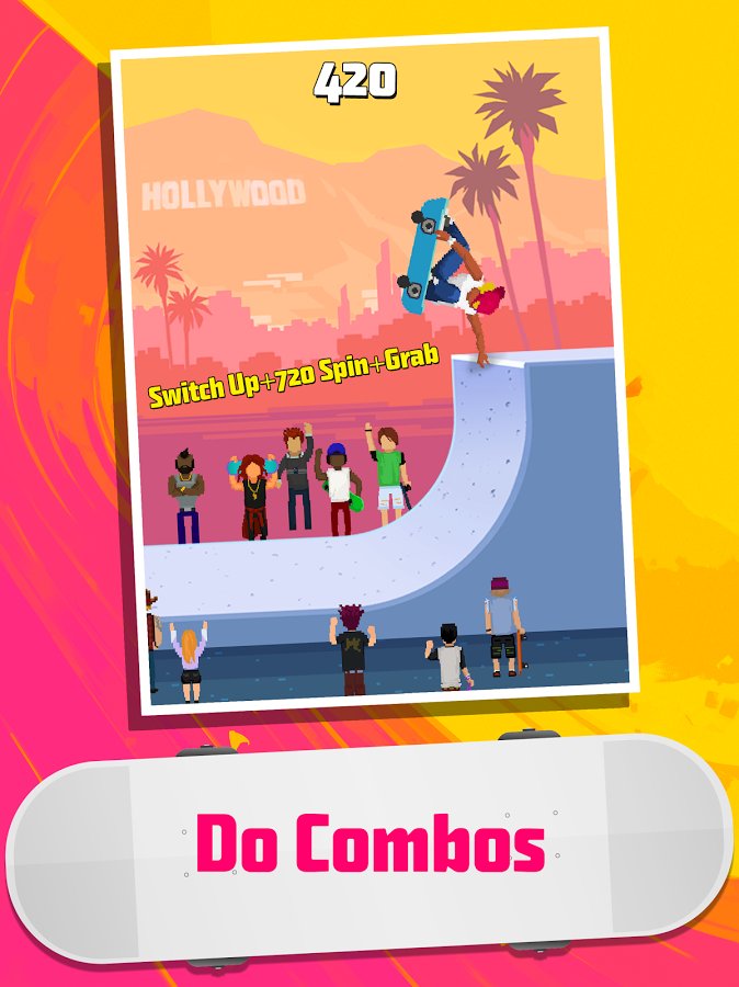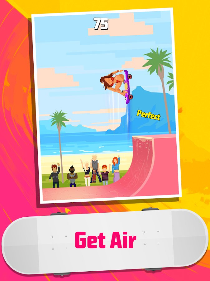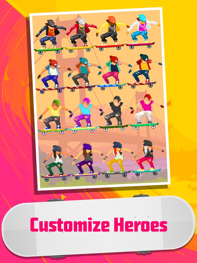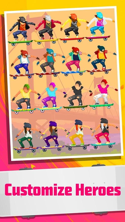 Halfpipe Hero - a dynamic sports game done in a nice retro style, combining pricelow graphics, while created in bright and colorful colors and of course the familiar musical style, it is worth noting that the game allows you to use your own play lists. All this in combination gives a Halfpipe Hero a pleasant atmosphere allowing you to relax and enjoy the gameplay. Now about this. Despite the obvious arcade Halfpipe Hero developers quite harmoniously combine simple controls and a huge variety of different techniques and tricks that you can combine and create their own chain. Of course there is a leveling system, characters and new places will be available to you as you progress through the game. There is also the opportunity to compete with your friends.