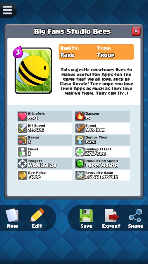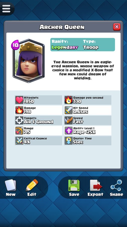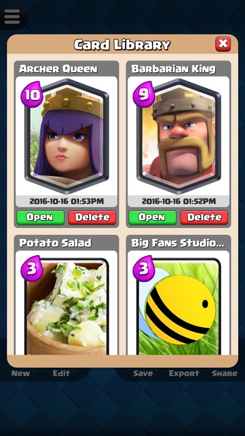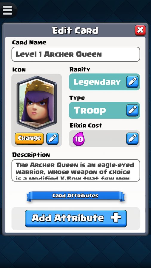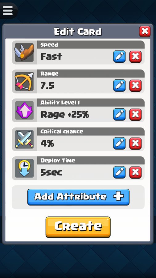 Any idea of the gamer can be implemented them in Card Creator for CR, because the developers of the game offer a wide range of unique tools. Now any crazy and exciting fantasy to be realized in short time with maximum convenience for the player. Create a powerful and incredibly interesting card with original attributes peculiar only to the legendary cards. Copy the results of their work in the library and eventually look there to assess the quality of previously created products. Beat your friends, play now!