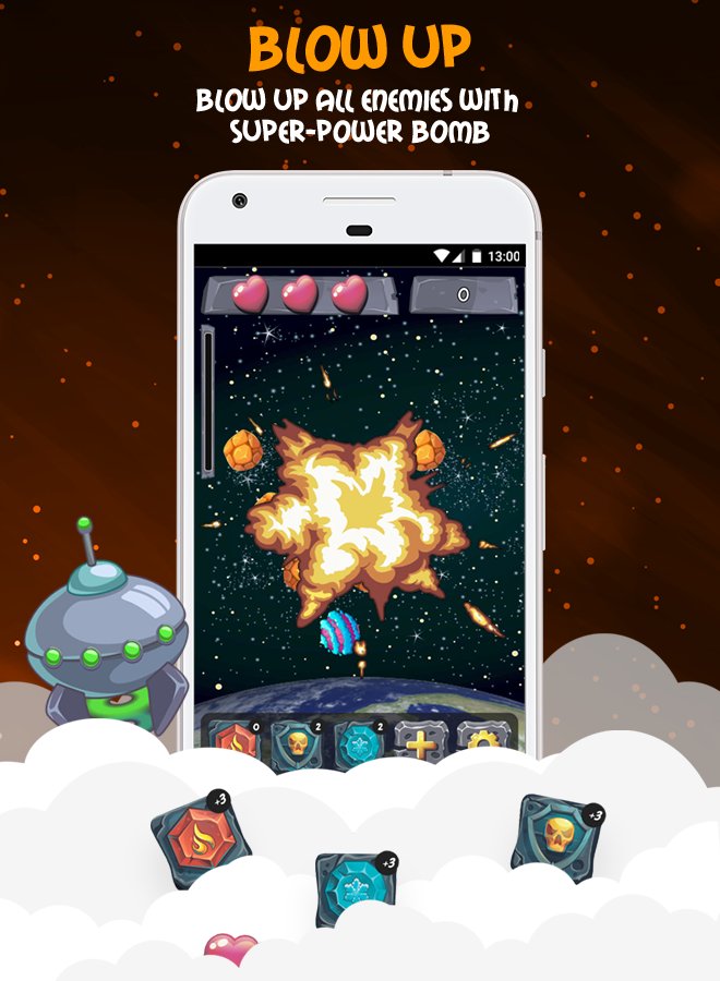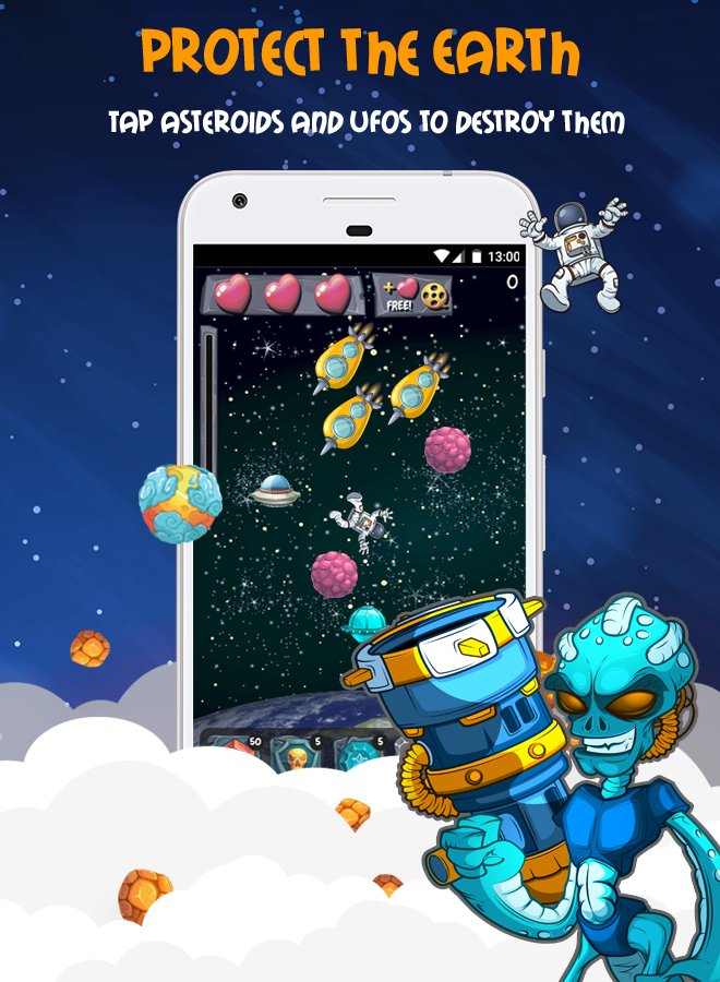 Space Smasher: Kill Invaders – a fascinating arcade on Android where you have to protect the planet from asteroids and UFOs. Your main task in this game is not to give falling to Earth from asteroids and alien invaders to pass on. Tap the screen of your phone or tablet as often as possible and remove all objects from the screen at the same time, letting go of the astronauts. With each new level complexity of game will increase and you will have to work hard to pass this game and set your record. Reach level 10 of the game and fight powerful boss. In the game you will also find great bonuses that will facilitate you the game such as freezing, explosion and shield.