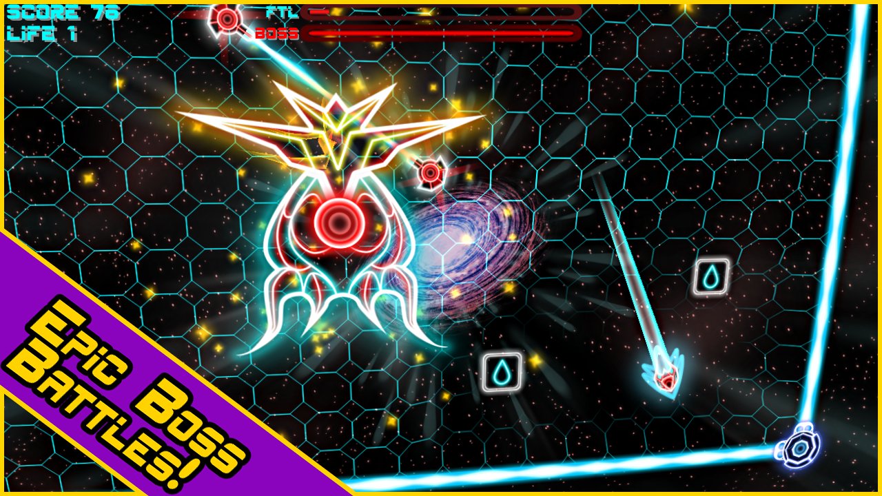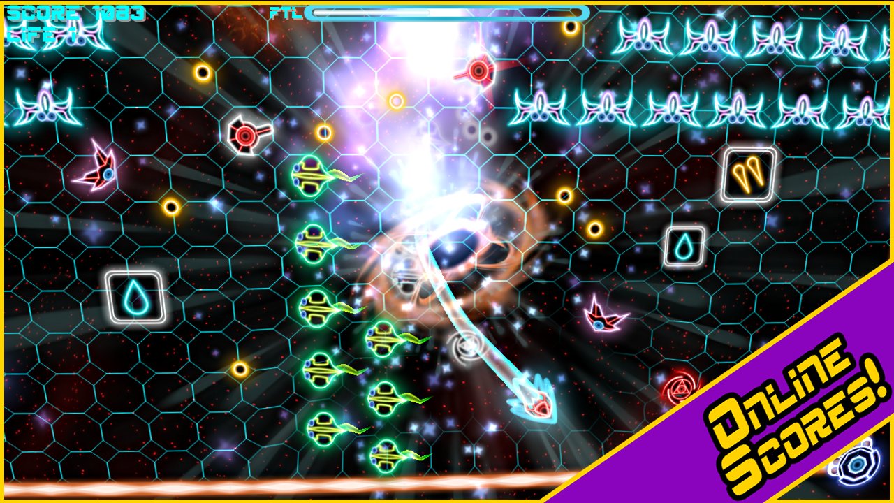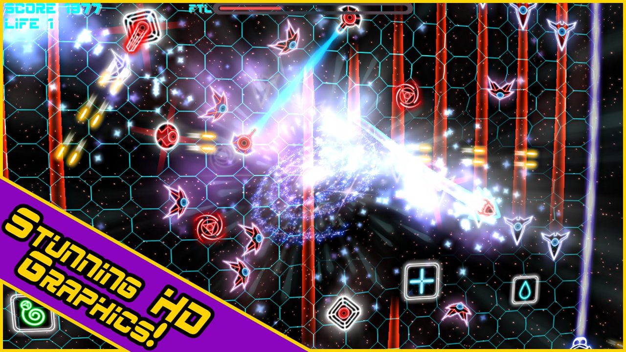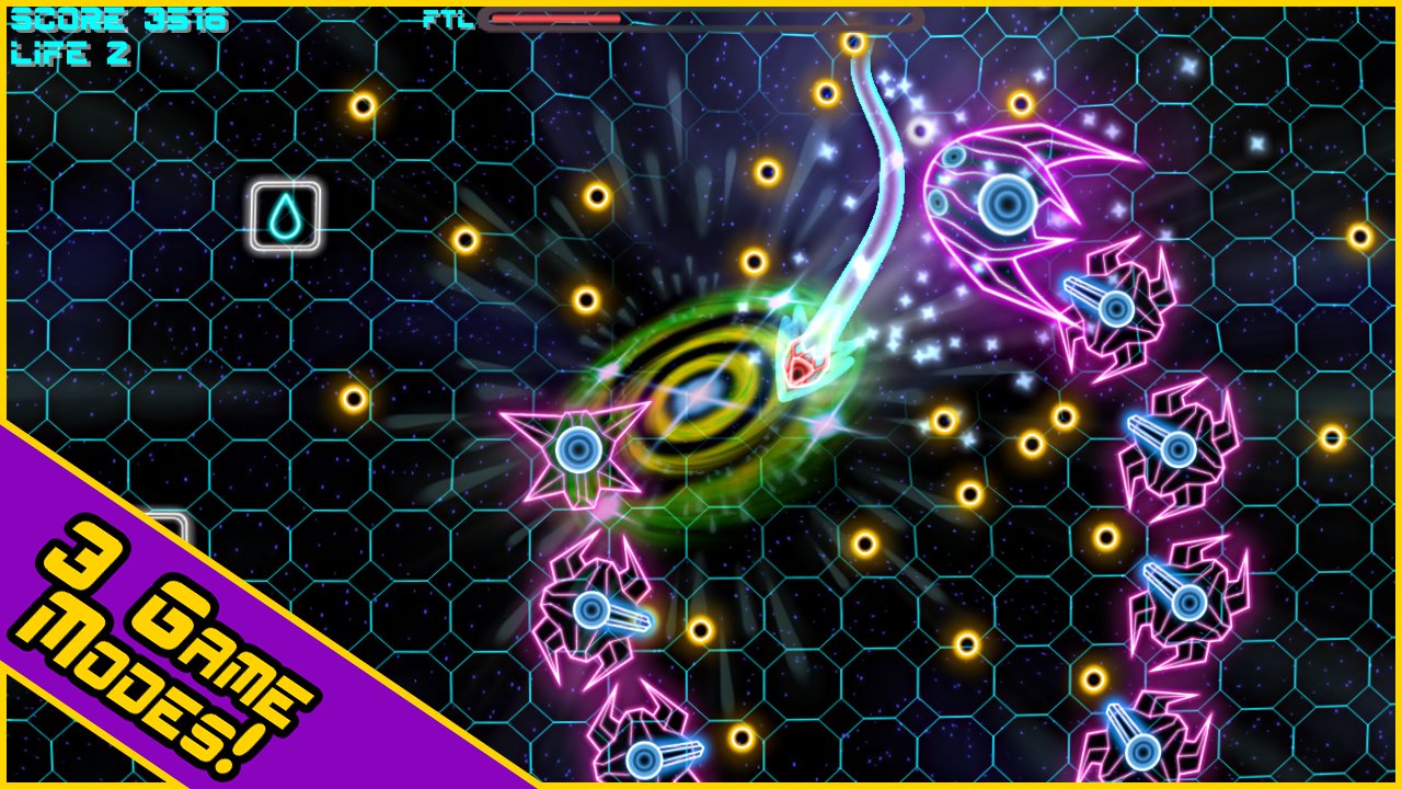Hyperlight EX - dynamic action shooter with the original filing. As in most similar games the story in Hyperlight EX virtually no, we only know that you are a commander of a space ship caught in a difficult situation, surrounded by hordes of enemies, and although your ship is equipped with weapons you will still be able to fend for themselves. Shuttle the controls that you are may in a second to accelerate to the speed of light and in this condition can destroy all what will face, this is the property you have to use a destroying enemies.