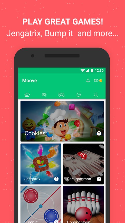 Moove - Chat, Play, Meet - Meet, chat and play various games directly in chat. This is a simple app that is part social network where you can look for friends or just like-minded people to unite in groups and to engage in a common cause. But beyond that, you can play games, from the simplest to the most complex. To simplify the search of your friends, you can attach several other accounts to it, and learn from friends who have already registered in this application and finds new friends.