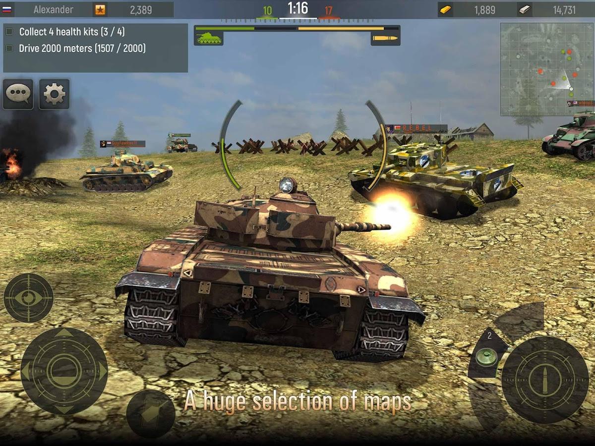 Grand Tanks: Tank Shooter Game – take part in tank battles taking place on various maps. In this game you will take control of tanks from different eras and manufacturers and check them in. Control the armored vehicle and drive it forward, destroying all enemies in his way. Carefully follow the map and hunt down your opponent, first opening fire on him. Shoot at the tanks of rivals trying to get into the most vulnerable places. Discover new tanks, get valuable awards and titles, and chat in General chat with other players and allies.