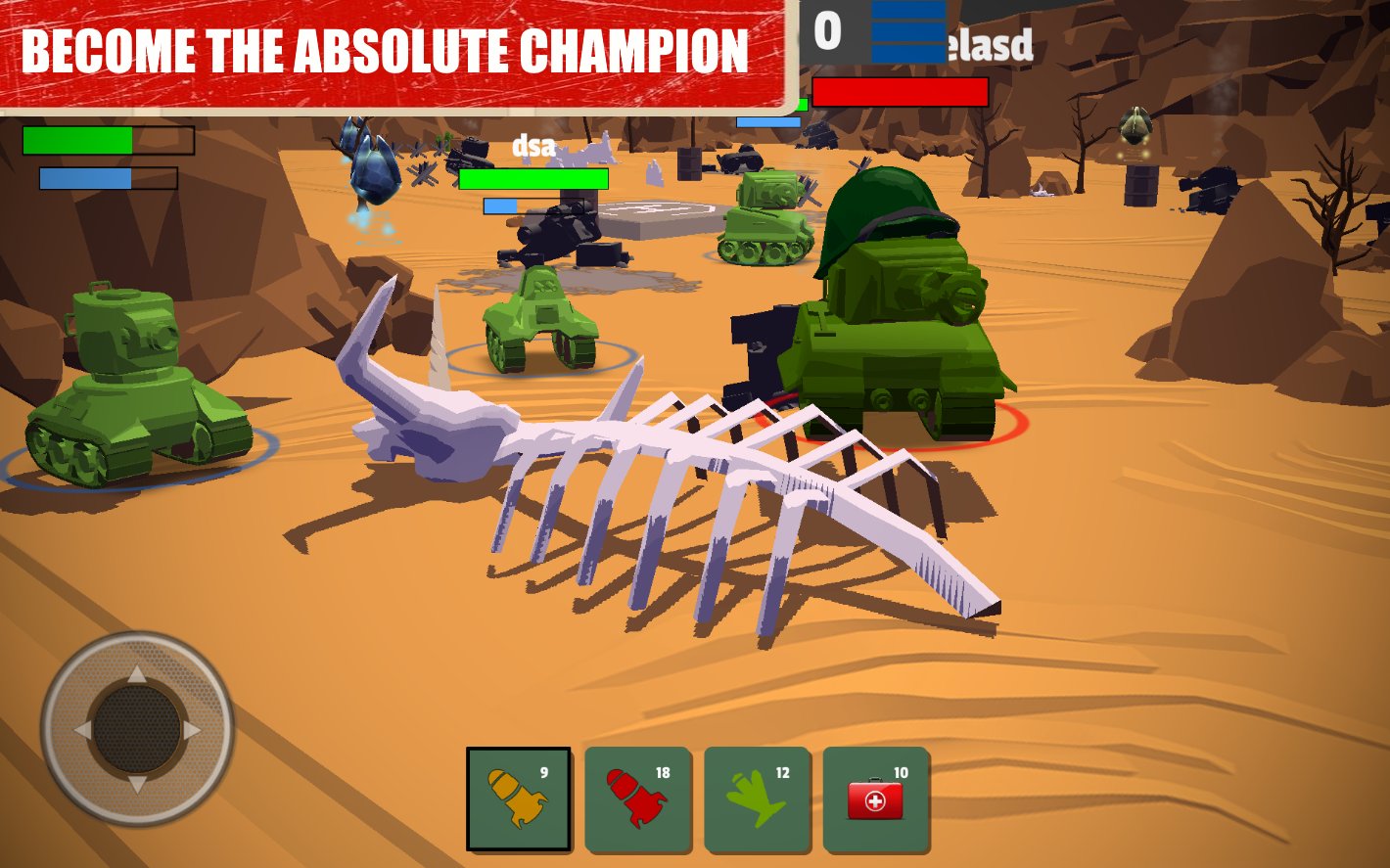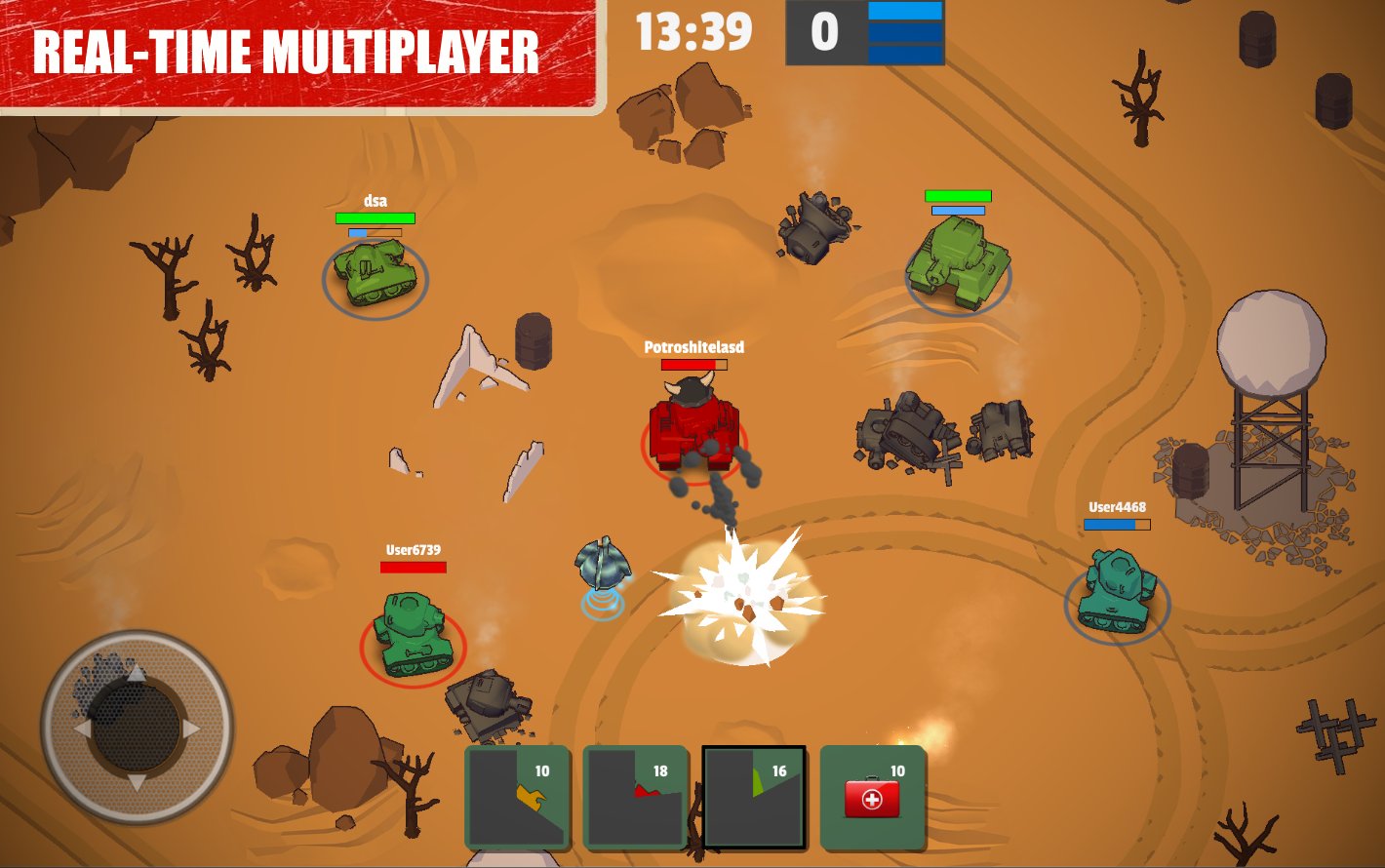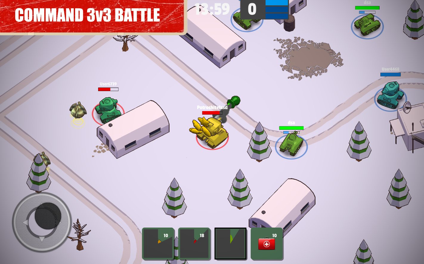 Crash of Tanks Online action game with cartoon graphics where you will take part in tank battles. In this game you take control of your tank and take your part in battle in 3 vs 3 format. Become a real ACE in this game and perform different tricks and maneuvers. Use different objects on the locations to take cover from enemy fire. Use to attack a powerful gun and with one shot destroy the enemy tank. Collect enough points for destroyed tanks opponents and unlock new tanks and upgrade them on your own.