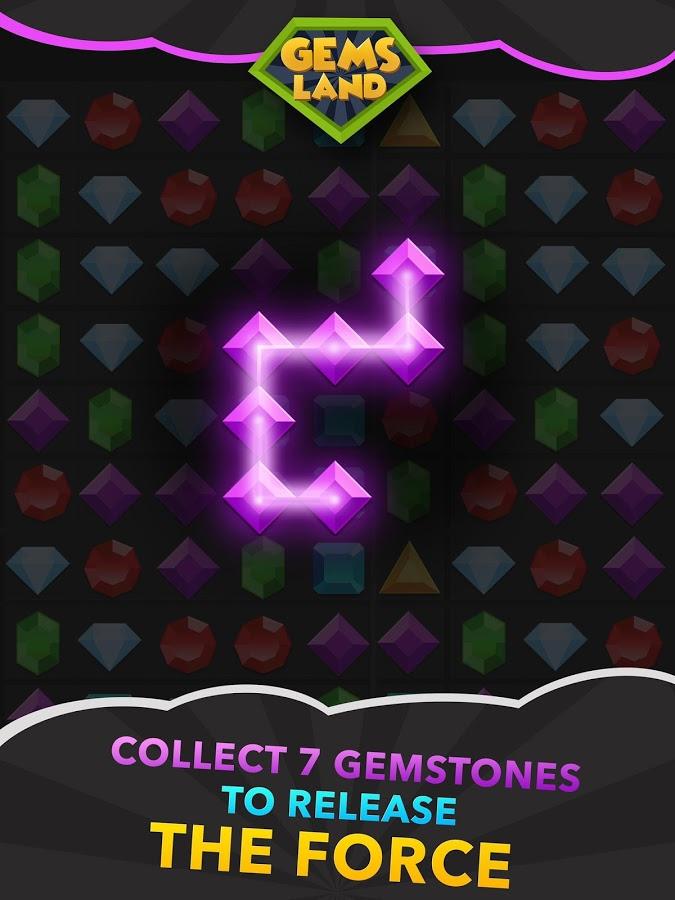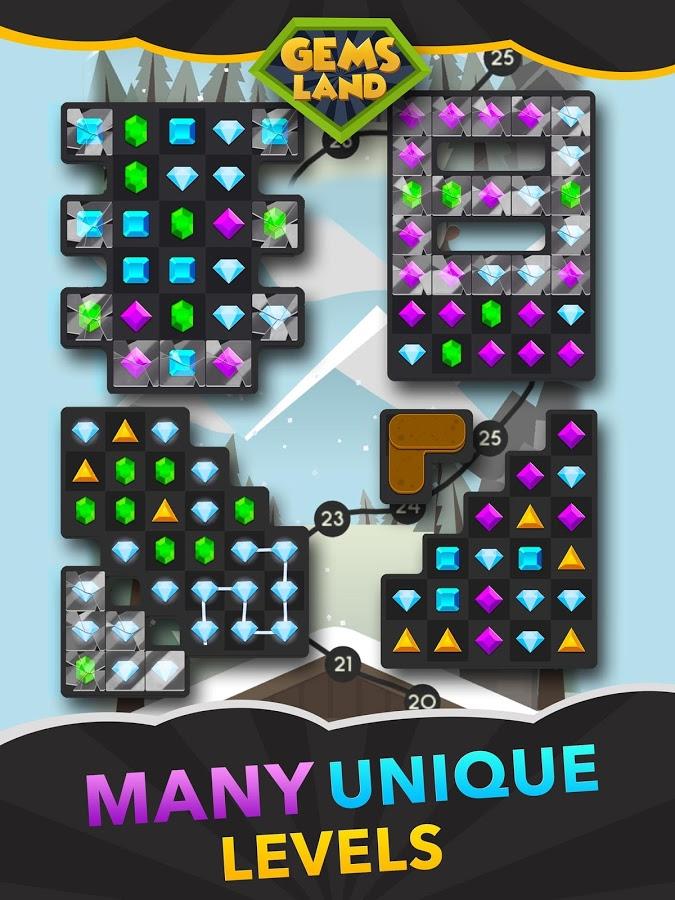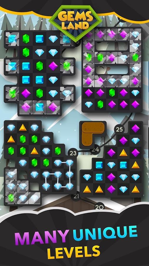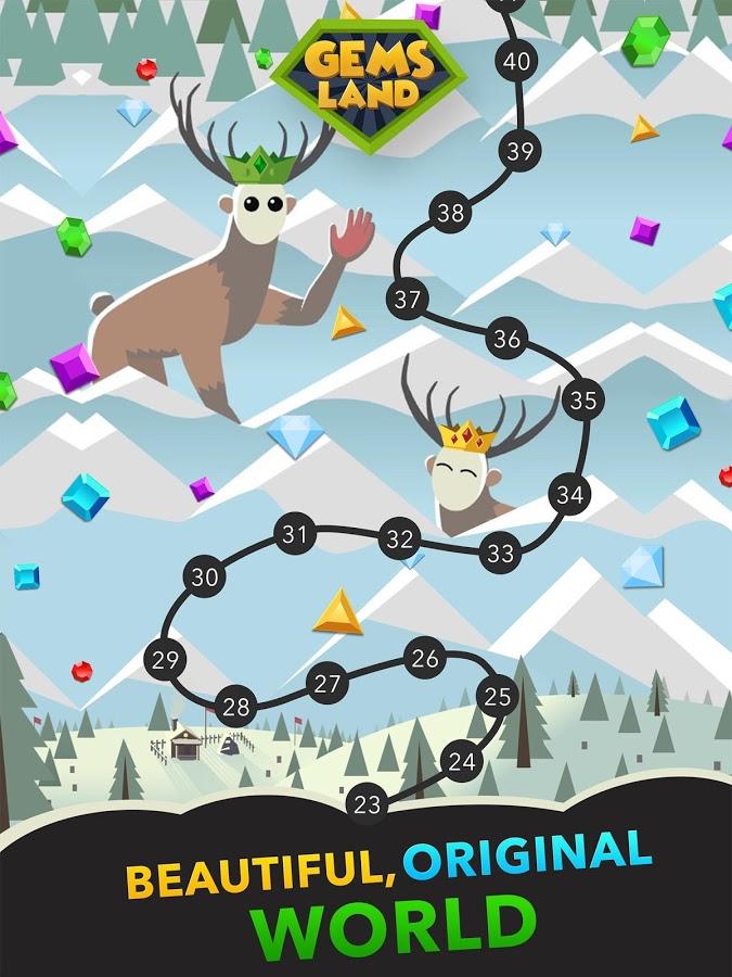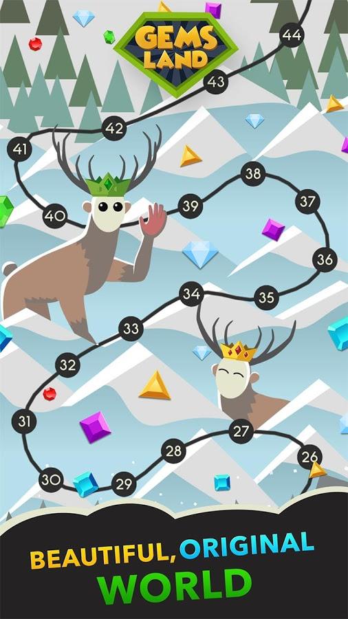 Gems Land-new free match 3 game, connect the dots! – exciting game of the genre three in a row on Android where you will travel through Dreamland, accompanied by the spirit of the Forest. Your task will be to make the maximum chains of crystals, and blow them up. The more you destroy the crystals, the more points you earn and will be able to compete with the best players. Use various boosters and power-UPS that will help you pass the most difficult levels. Use numerous bonuses and get three stars in each level. Complete all 50 levels of this game and travel through snowy forests and icy waters.