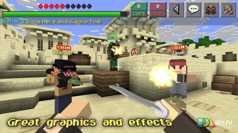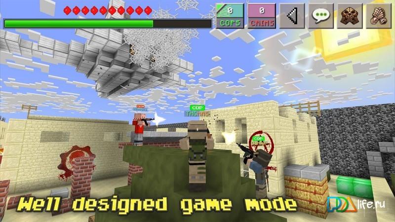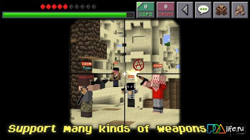 Cops N Crims: Multiplayer Mini FPS Game – an Interesting and exciting first person shooter game in pixel world. Play as cops or criminals with 24 other players from around the world! At your disposal will be a lot of weapons with different properties, such as accuracy, power bullets, the speed of movement of the player and others. You can also change the appearance of the player and even download other skins from your device!