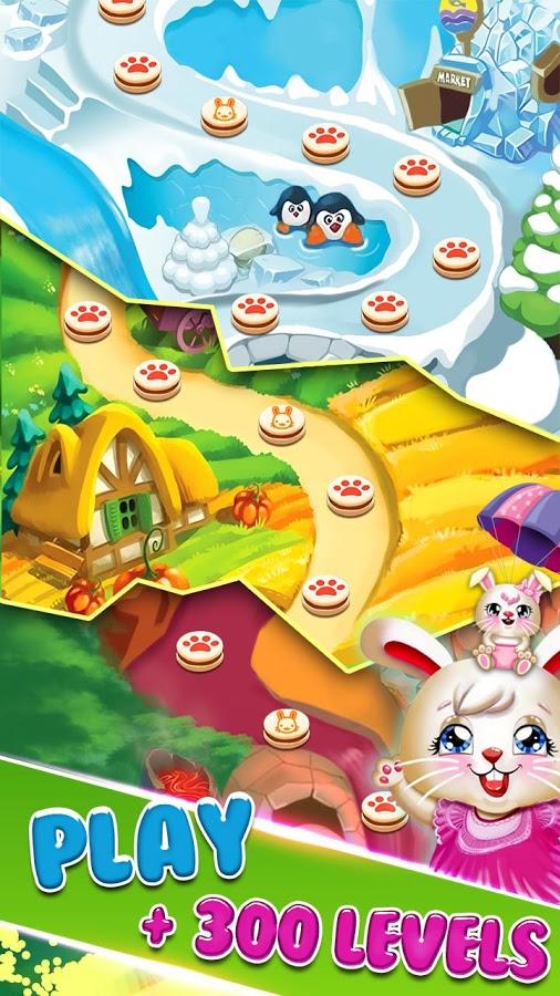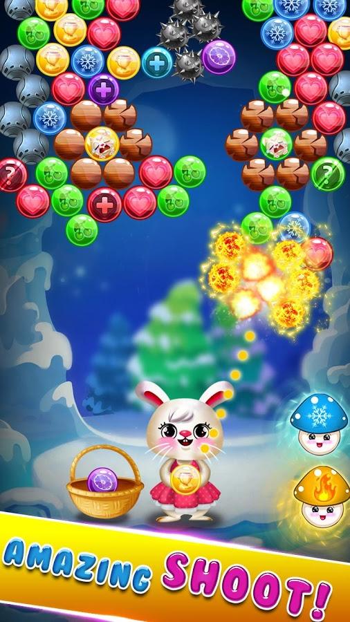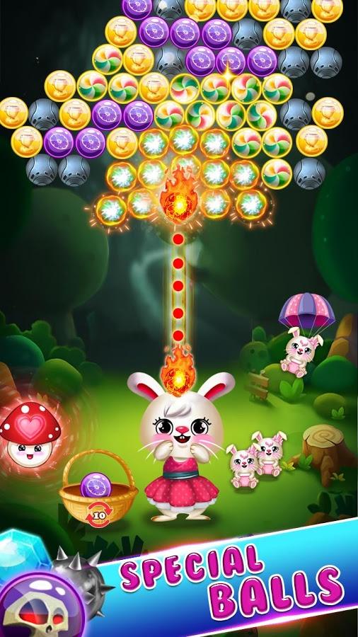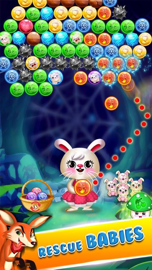 Bunny Bubble Shooter Pop:Island Magic Match 3 puzzleon Android where you will help a rabbit to get his kids back. Rabbitsplayed on the lawn when they were kidnapped by evil forces and imprisoned in bubbles. Nowyour task will be to help rabbit to shoot colored bubblesa cluster of them up there and release rabbits. Accurately calculate the trajectory and shootbubbles to match three or more bubble in a row and make them disappear.Make combo explosions and enjoy excellent special effects. Usealso numerous bonuses and power-UPS and beat levels faster.