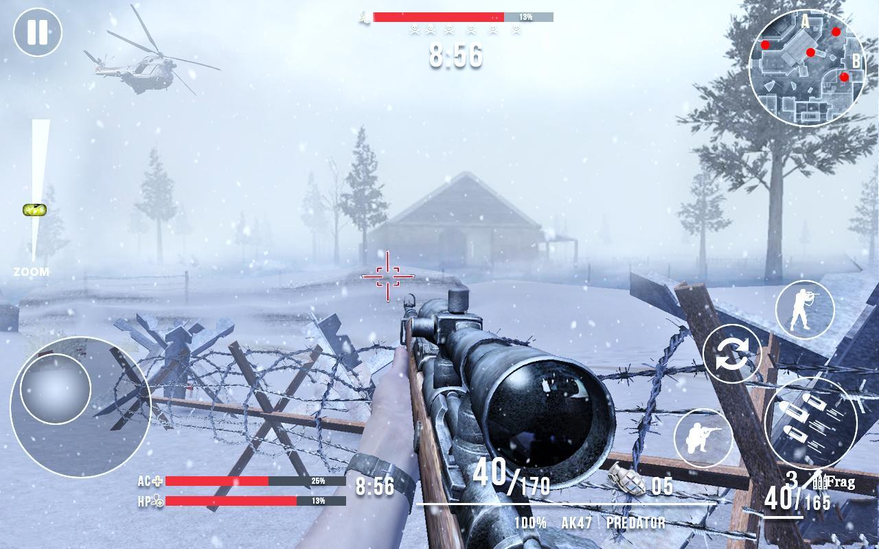 Call of Sniper WW2: Final Battleground – a first-person shooter for Android where you will participate in military operations of world war II. Take control of your well-trained soldiers and infiltrate enemy lines, trying to destroy the Nazis and to perform a dangerous operation. Challenge the enemies and fight fierce battles in various territories. Use your sniper rifle, various lenses and hand grenades for the detection and destruction of enemy bases. Develop your tactics of warfare and enjoy the realistic ambience and sound effects. Navigate through the snowy forests of Siberia and use the map to identify the enemy.