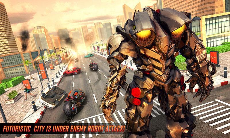Flying Robot Bike : Futuristic Robot War – take control of a giant robot which can transform into a flying motorcycle and patrol the streets of the city. In this game you will become the guardian of the inhabitants of the city that are attacking the evil robot and destroy everything around. Transform a robot into various objects, and ride a bike on city streets or floating in the air, exploring all the new areas of the city. Join the fight with strong opponents and show all their skills and fighting techniques. Use a powerful weapon against the enemies or fight with robots at close range.