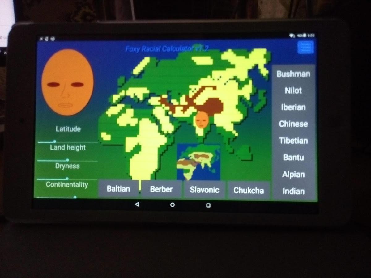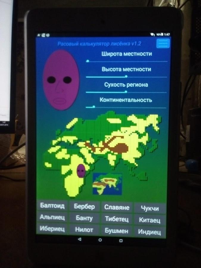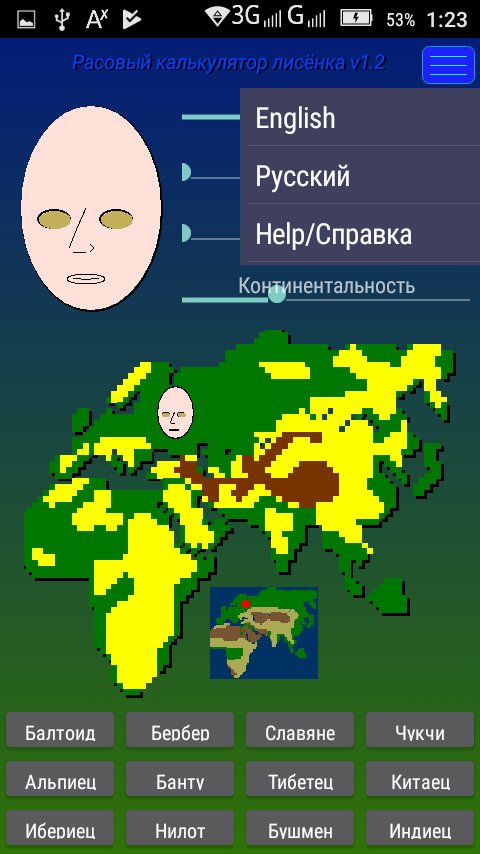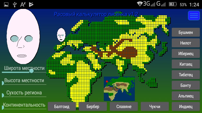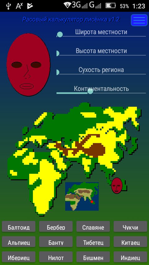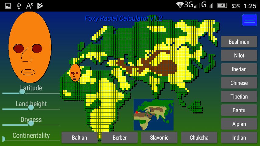 Foxy race calculator - shows a direct relationship between the shape of the human head, nose, lips and eye shape and climate of his place of residence. To obtain the schematic picture of the living on a certain territory enough using the controller to set the parameters of the area. The longer they lived in the region his ancestors, the better will the picture. If you have difficulty with the definition of some characteristics, such as elevation above sea level, you can just specify the location on the large map or choose a nationality, and the app itself will reveal this result.