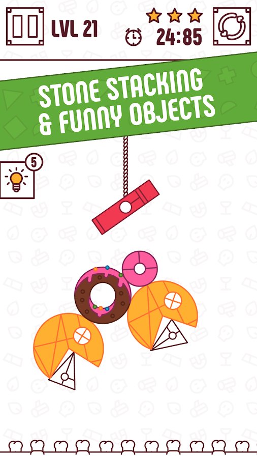 Find The Balance - Physical Objects Funny Puzzle – exciting puzzle game for Android where you build a tower of different objects. Various objects are tied to a rope and go down, your task will be to install them, cutting the rope so they built a tower and kept the balance. Put the objects in different sequences and keep the balance, without dropping them uncontrollably. Train your excellent response and intelligence complete 100 levels of the game. The game features 4 modes such as: classic, stars, infinite, and Christmas. Unlock all 10 cutting items and enjoy the realistic physics.
