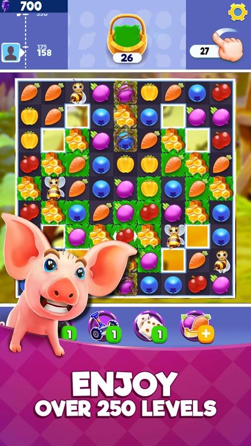 Farm Slam - Match-3 Build & Decorate Your Estate! – an exciting game of the genre three in a row on Android, where you will be transported to the farm. In this game you will get acquainted with cute and diverse characters, which will help to make rows of the same vegetables and crops. Rely on your ingenuity and excellent response and match three or more items and earn coins, which you can spend on buying adorable items for the farm. Ahead of you waits an exciting journey where you are over 250 levels will roll up our sleeves to make rows of objects.