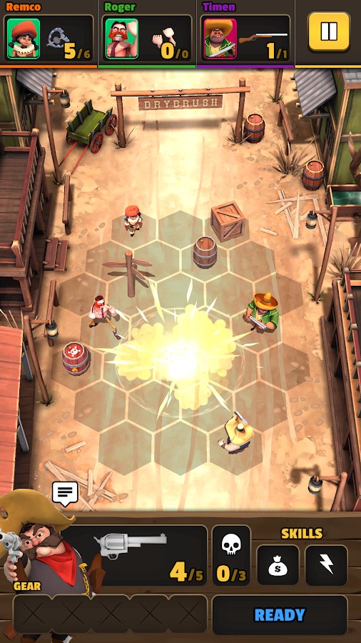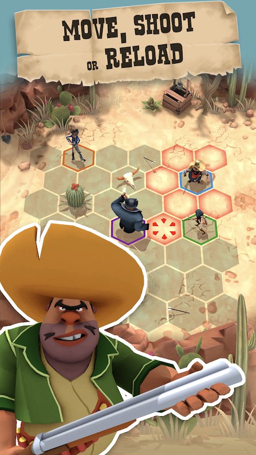 Pocket Cowboys: Wild West Standoff a tactical turn based strategy where you have to compete with real players. The playing field consists of a hexagon divided into elements of the same shape. completing the turn, each player sets the hero a specific list of actions which rivals know only as they occur. This intrigue gives the game interest and will allow you to use any tactical scheme. Nice graphics and the setting of the Wild West will give Pocket Cowboys: Wild West Standoff, not a few pleasant aspects.