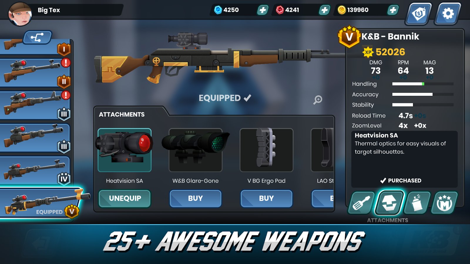 - 4 weapons manufacturer, each with its own unique style: Griffin, Blackburn, LAO and K&B