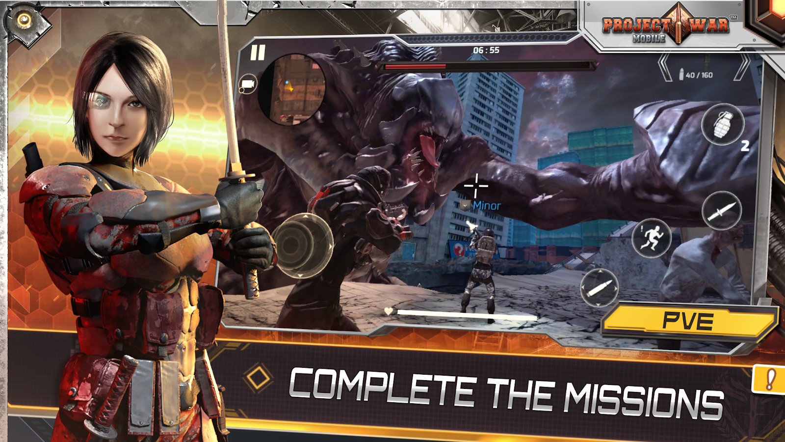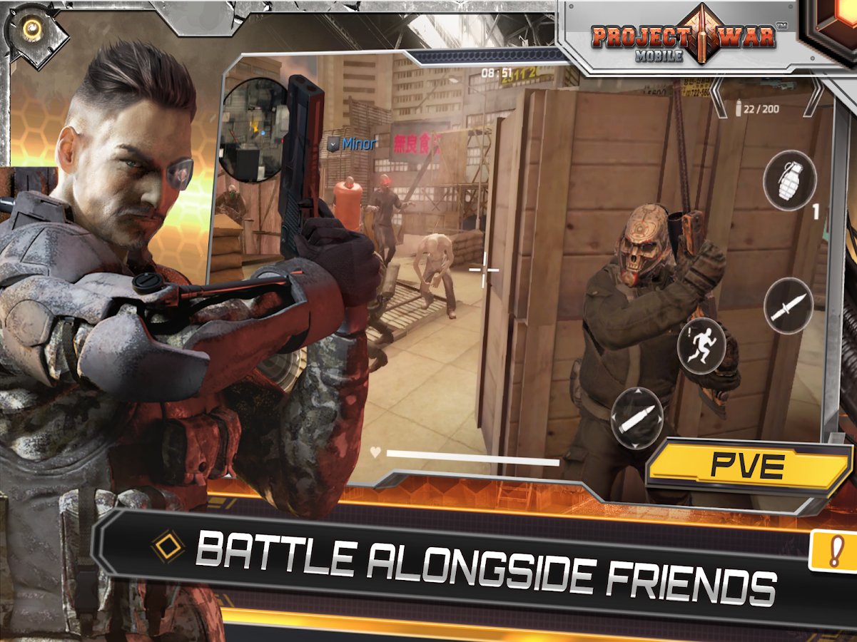 Project War Mobile (PWM) is an action game of this generation on Android. In story mode you have to play the role of a soldier of the Seventh sanctuary, solving the mystery of the undead and watch as the action unfolds and the drama. In multiplayer mode you can battle with online players around the world, climbing the rankings to become number one. Upgrade your weapons and equipment and raise the level of your character. In story mode you can kill bosses together with your friends. Create your own clan and have unique rewards for completing levels.