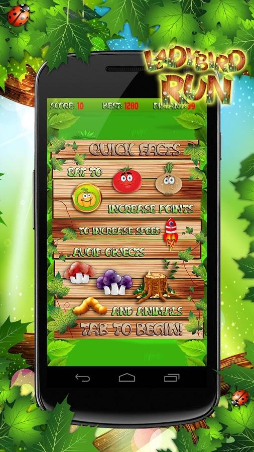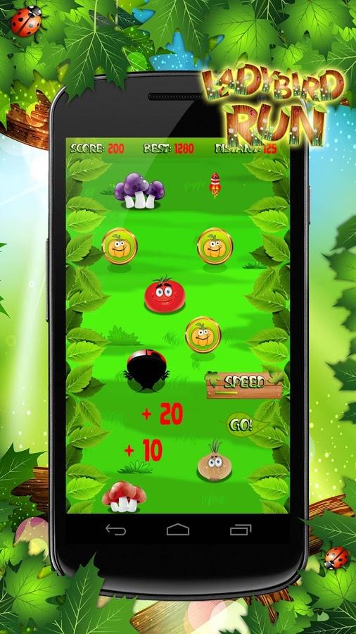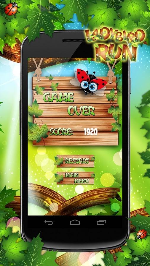 Ladybird Run - У вашему вниманию представляем красочную и увлекательную игру в стиле «аркада», где главным персонажем является изрядно проголодавшаяся божья коровка. Игровой процесс заключается в том, что вы должны запускать божью коровку из рогатки, контролируя её скорость. А затем с помощью акселерометра управляйте ею из стороны в сторону, стараясь собрать как можно больше еды и уворачиваться от препятствий: ядовитых грибов и насекомых. Игра заканчивается тогда, когда вы промчитесь мимо очередной рогатки и коровка остановится, а также если вы успеете увернутся от препятствий. Особенностями игры являются симпатичная графика и приятная музыка.