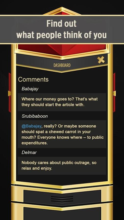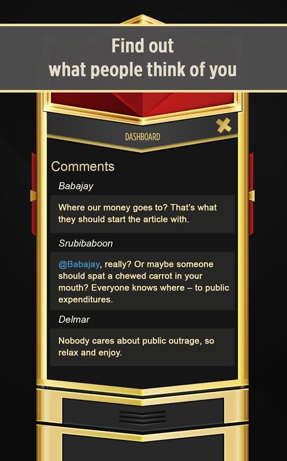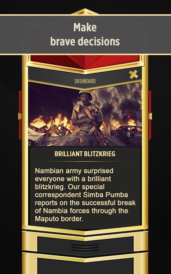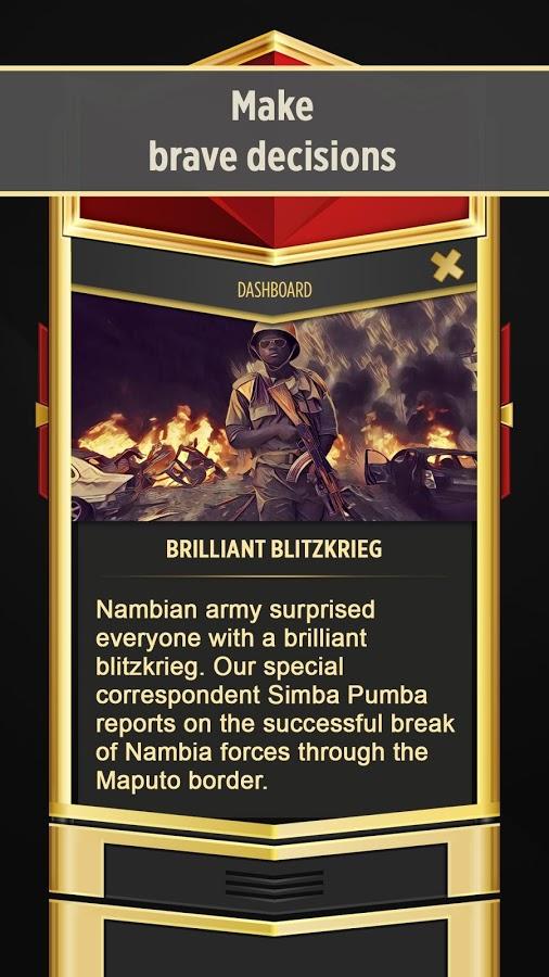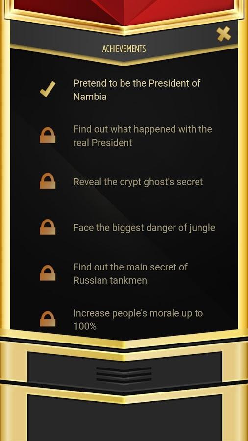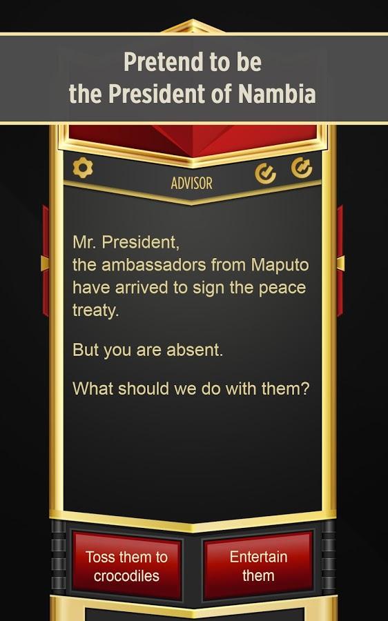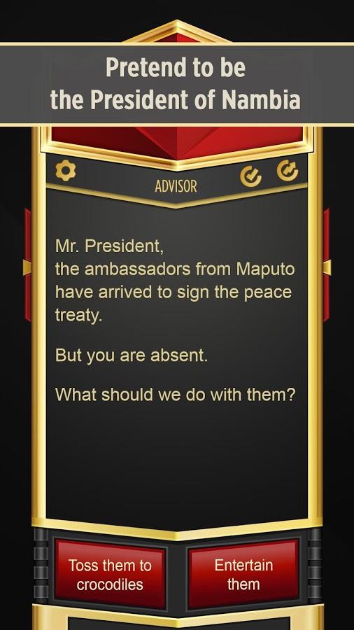 Mr. President - text adventure game on Android, in which you ll assume the role of President of the African Republic of Namibia. Once you have found the telephone of the head of the country and you start to report all the events. Now you have to answer messages on behalf of the head of state and observe how your choice affects the main indicators of the Republic: the size of the Treasury, the morale of the people, population and more. Together with a dedicated Advisor you will find a fascinating adventure with an unpredictable plot.