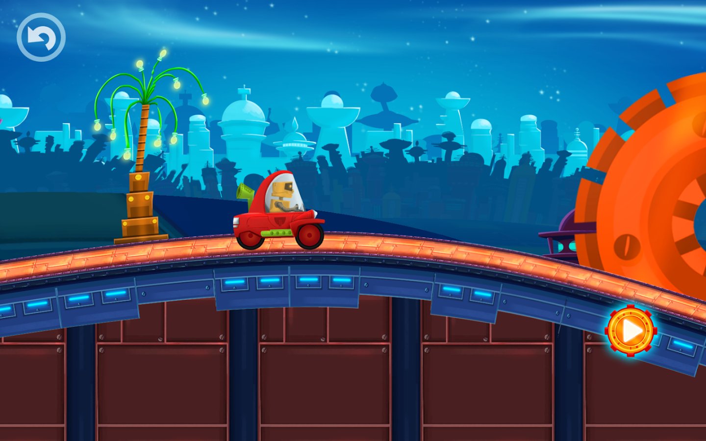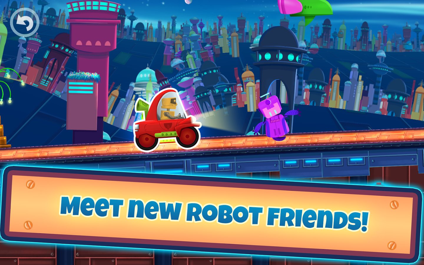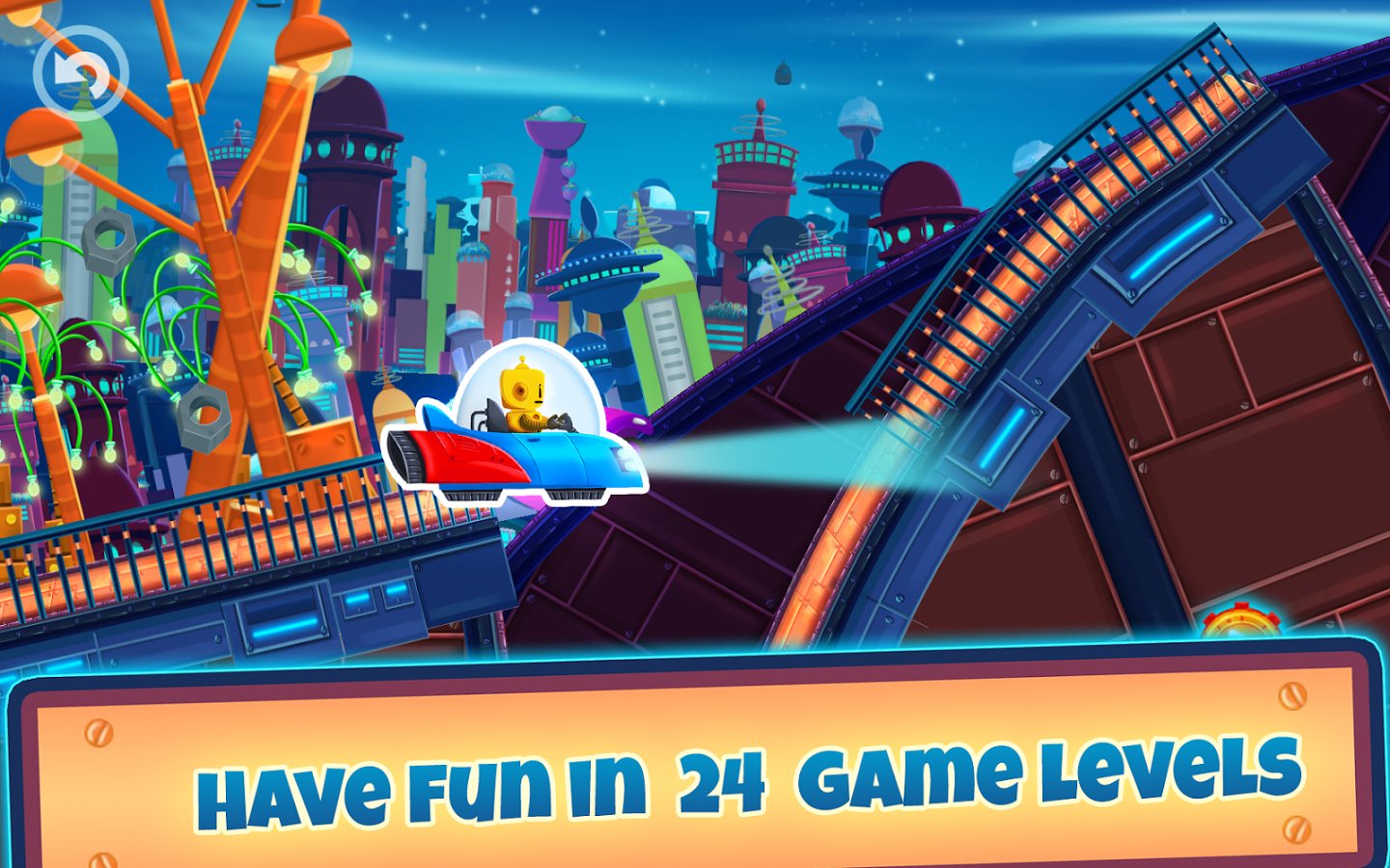 Cute Robot Car Racing – interesting game suitable for both children and adults. In this game you will take control of a funny robot who travels to a distant planet in his car. Help the robot to pass all the tracks of this game and not to fall in the trap, avoiding all obstacles on the way. Drive your car or Vice versa to increase or decrease it with a single touch of a finger. Streets of a huge metropolis and meet new friends who will meet you on the road. Come to the finish and unlock new exciting levels. In the game you will find 2 amazing world, 24 unique levels and 4 cars.