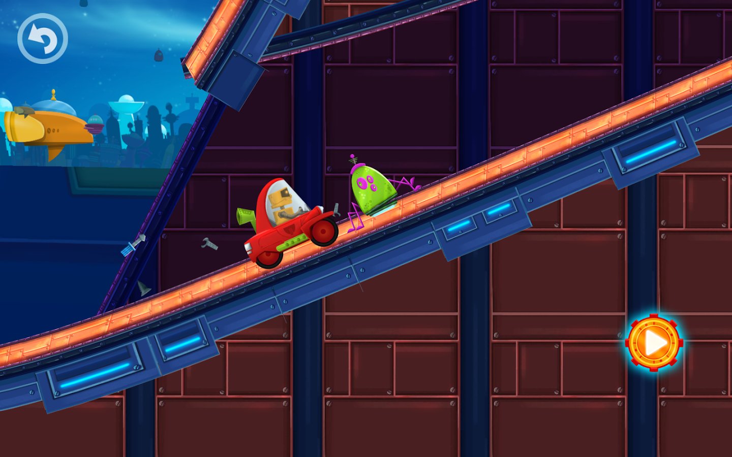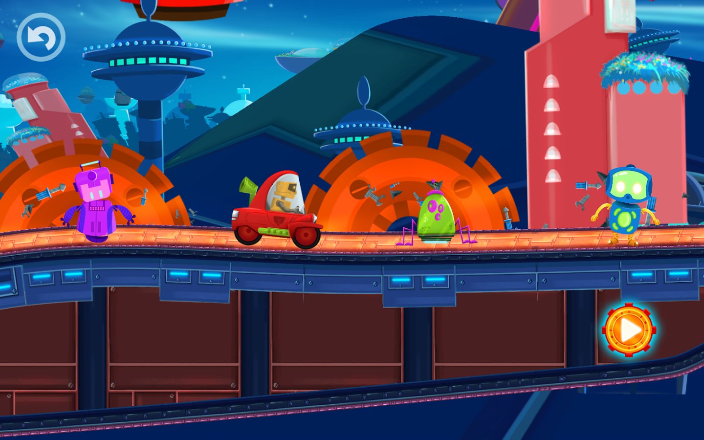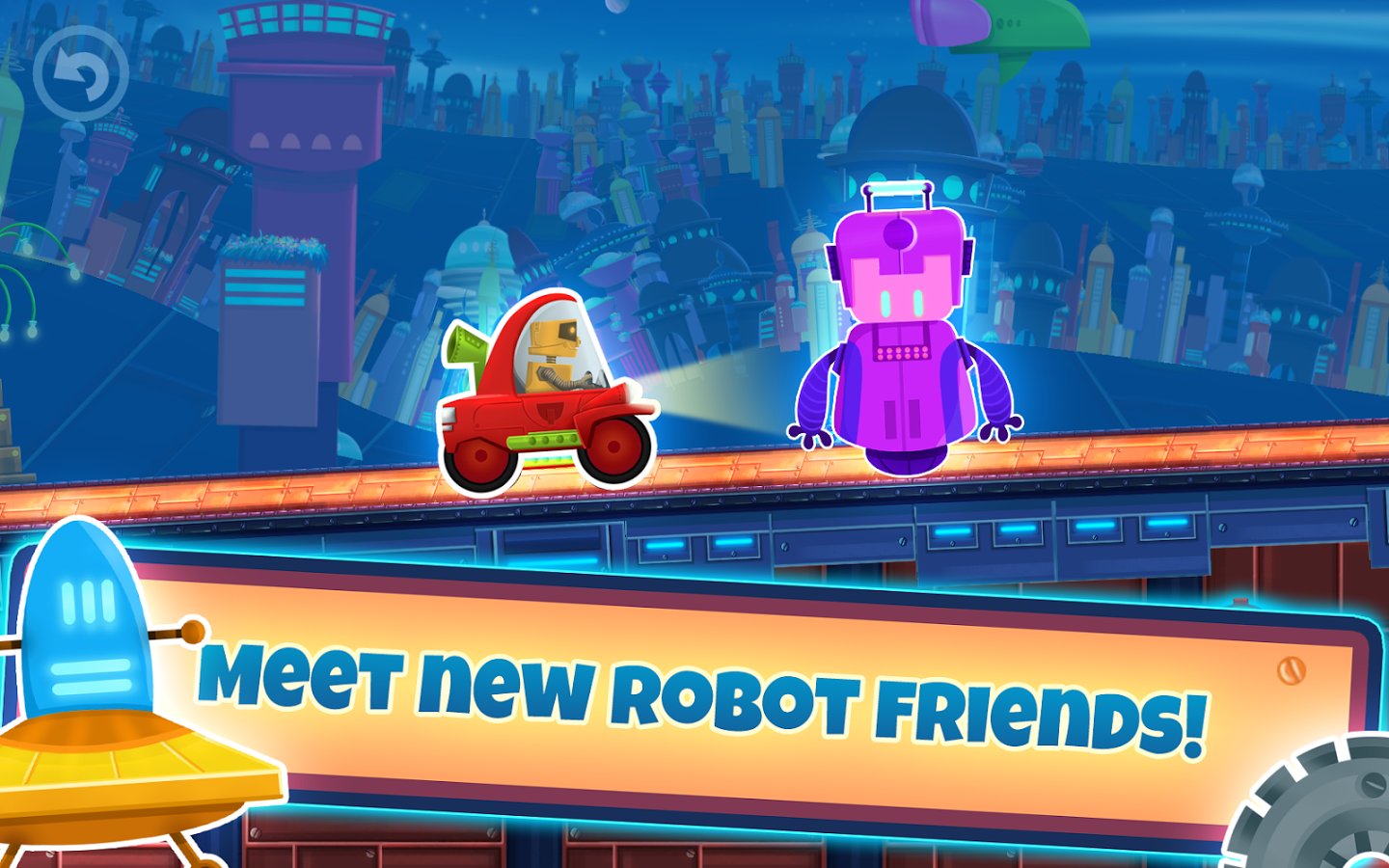 Cute Robot Car Racing – interesting game suitable for both children and adults. In this game you will take control of a funny robot who travels to a distant planet in his car. Help the robot to pass all the tracks of this game and not to fall in the trap, avoiding all obstacles on the way. Drive your car or Vice versa to increase or decrease it with a single touch of a finger. Streets of a huge metropolis and meet new friends who will meet you on the road. Come to the finish and unlock new exciting levels. In the game you will find 2 amazing world, 24 unique levels and 4 cars.