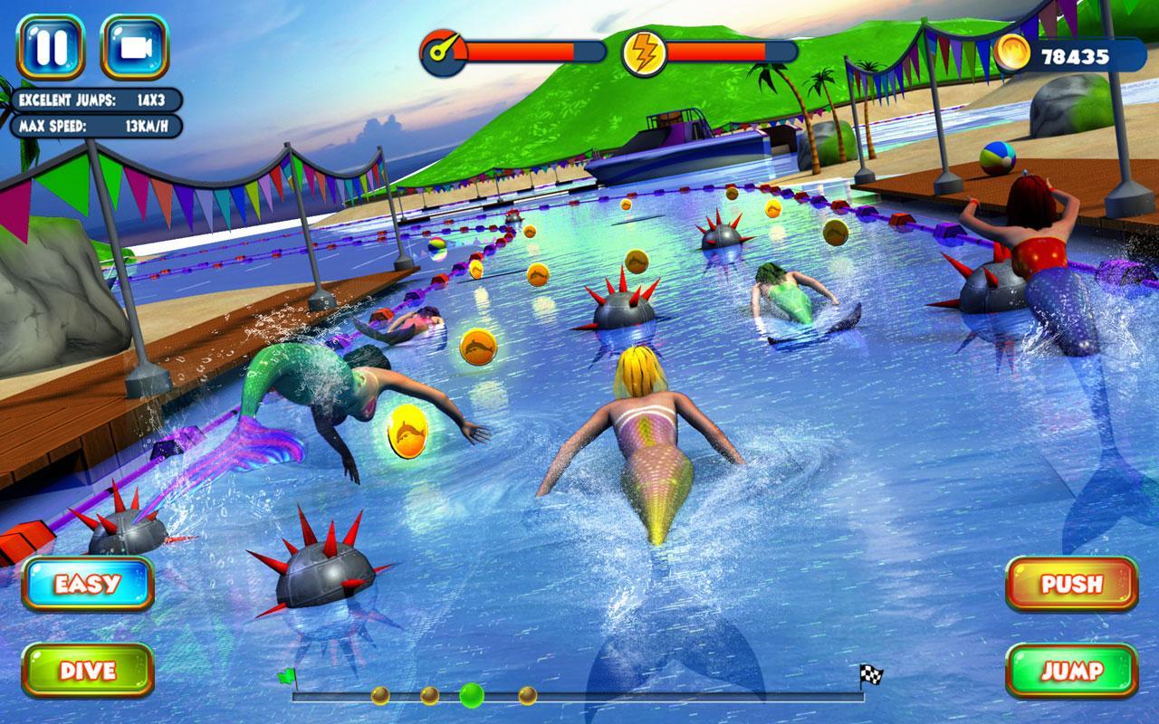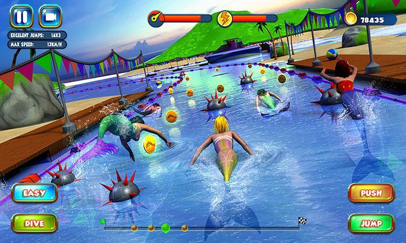 Mermaid Race 2016 – take control of mythical mermaids and guide them through challenging tracks of the game. In this game you take your part in the competitions of mermaids floating through difficult tracks and avoiding numerous obstacles on the way. Control the movement of the mermaids and help them to reach the finish line and avoid all obstacles on the way. Touch the screen at the right moment and jump through rings, floating under the spikes and move from side to side to bypass the numerous traps, mines and laser beams. Get to the finish line as quickly as possible and set a record in this game. By the way don t forget to collect coins and bonuses.
