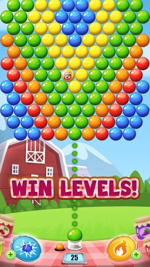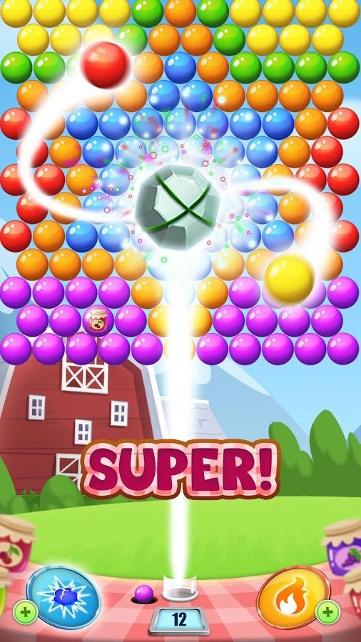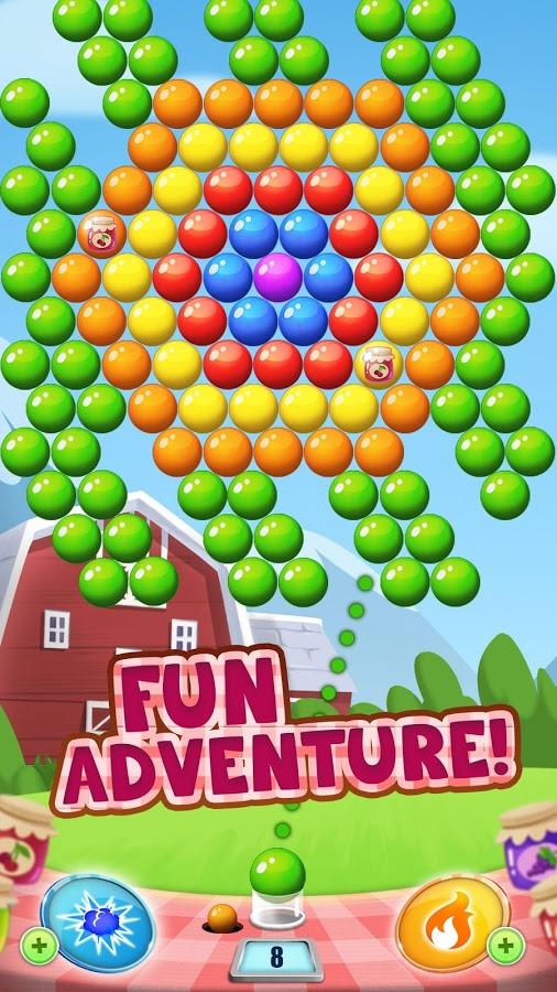 Jam Journey Pop game for Android genre of three in a row, where you will help farmer Joe to get as much jam. In this game your task is to shoot colored bubbles at a cluster of them up there and blow them up. Try to collect three or more same bubble together and blow them up, thereby gaining points. Aim and choose the correct trajectory of the bubble, blasting the highest possible a group of bubbles. Come exciting levels of this game and get three stars for each of them. Set records and use in action numerous bonuses and power-UPS.