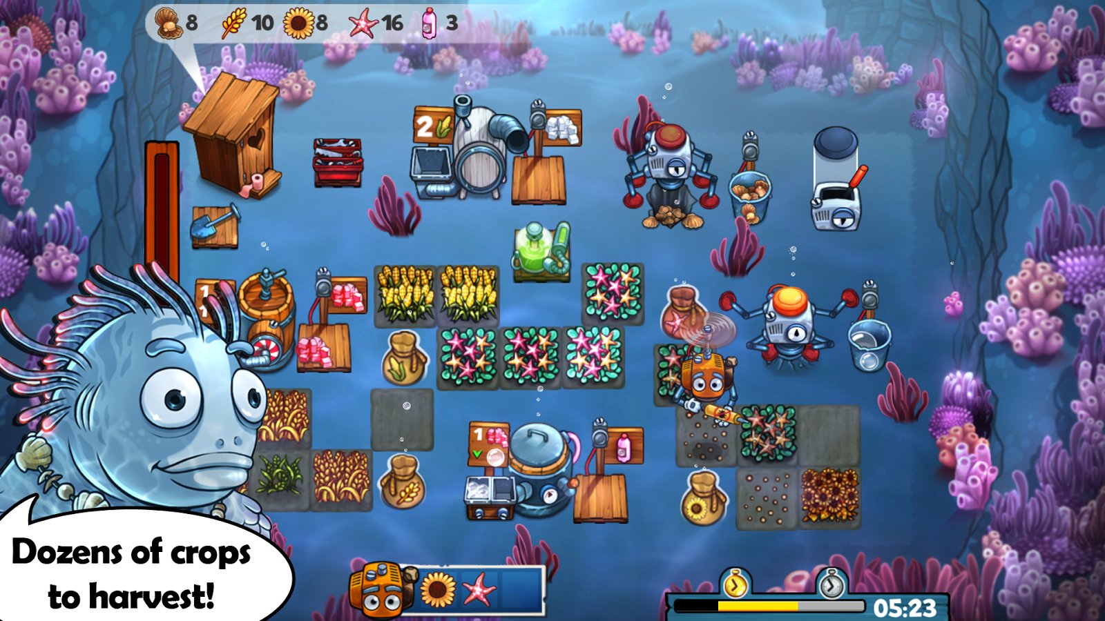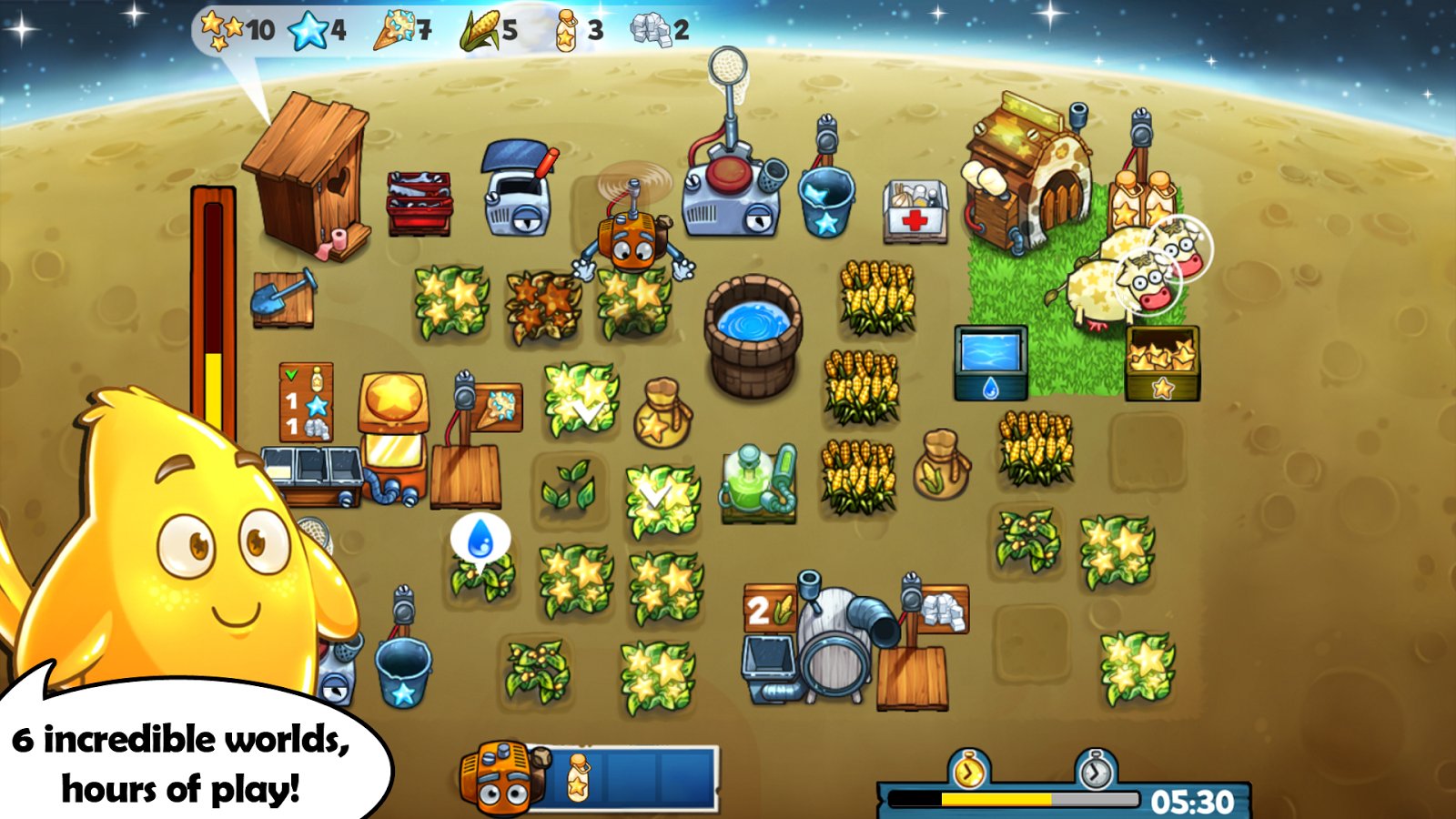 The Flying Farm is a adventure game for Android where you will operate a flying farm. In this game your task is to take care of the farm, grow up various cultures, as well as travel to the moon to return parents to their baby. Embark on a dangerous journey and fly through the endless sky, make your way along the bottom of the ocean and on the edge of the hot volcano, before reaching the moon. The game features a large variety of levels and missions that you will perform. Grow crops, take care of Pets and hire yourself a branched robot named Marvil, who will help you in business. The game will give players a great storyline, numerous characters and exciting missions.