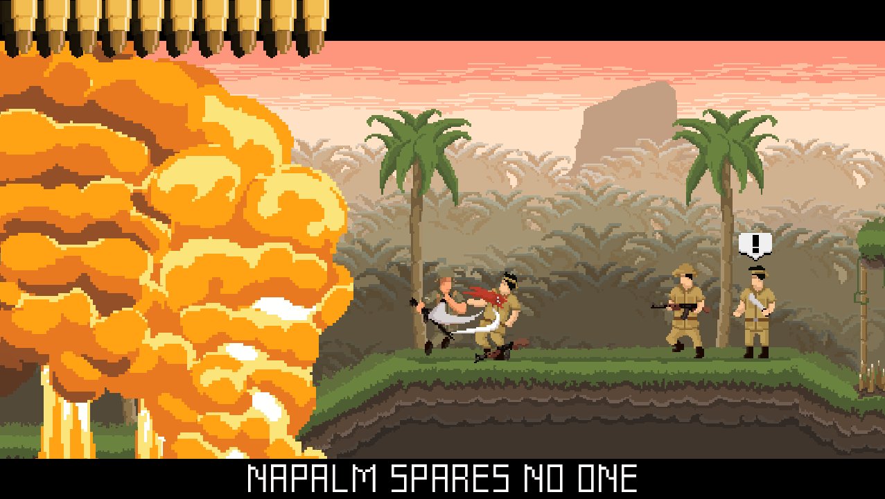 And so, we have a game called Lost Fates the story which tells us about a simple guy who have called for service in Vietnam. Game mechanics is built on the classic genre style, and the Lost Fates is a horizontal shooter platform game, so your main task will be to run forward and destroy enemies. Visually, the game is made in pixeling style.