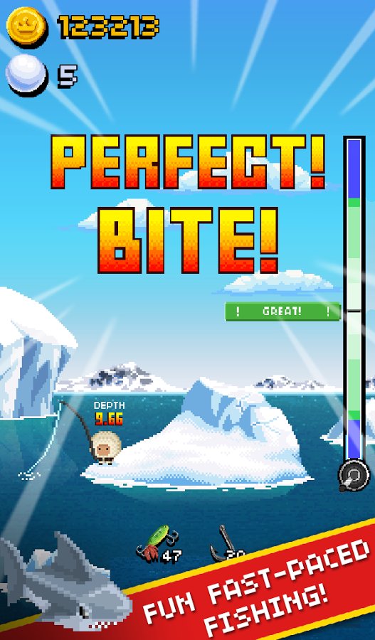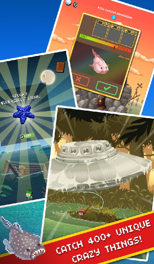 Desert Island Fishing - a fishing arcade gameplay which is extremely simple, you are on a tiny island are forced to produce their own food, but the piece of land is so small that the only food source will be fishing. Erecting the pole you sit on the shore, by adjusting the strength and direction of the throw throw line, and at the right time you need to strike the prey. And it is here that the fun begins, you can catch one of several dozen available rybach, and maybe you will get an unexpected catch in the form of a certain object. Your task is not only to feed themselves, but also to collect a full collection of items. Finished on one island, you have the opportunity to go to other parts of the world.
